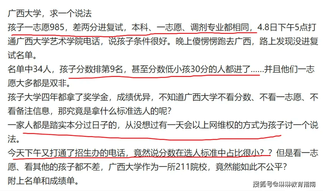 原来名单中34个人,自己儿子的分数排名在第9分,也就是说分数比自己儿子低30分的学生都进去了,而且他们第一志愿不过是双非,自己儿子的第一志愿可是985!再加上各种奖学金的加分项,让家长更加难以理解——广西大学为何不要自己的儿子!