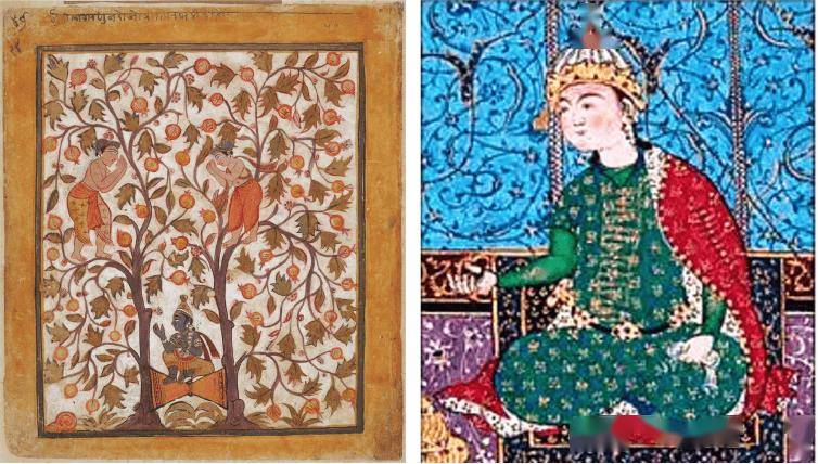 左图:一部18世纪版本的毗湿奴教经典《薄伽梵往世书》中的一幅插图,树上的为那吒俱伐罗及其兄弟。