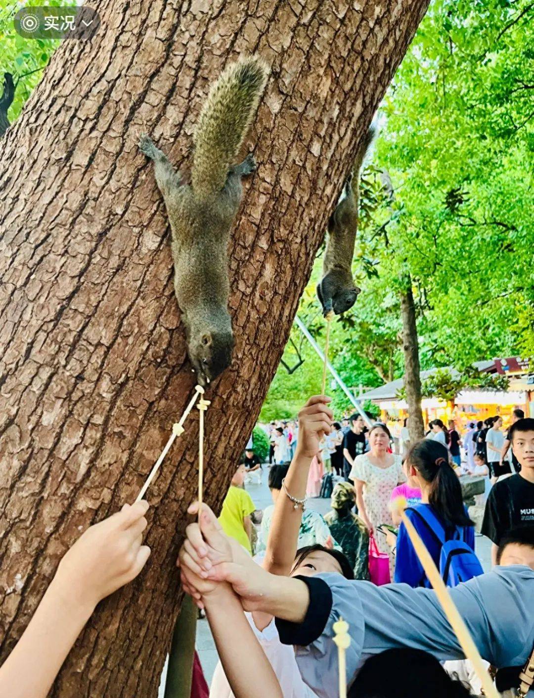 现场图片显示,几只松鼠倒挂在树干上,啃食游客递到嘴边的食物,其中有木签串着的玉米、香肠和香蕉等。被喂食的松鼠体型发胖,腹部鼓起,并不怕人。