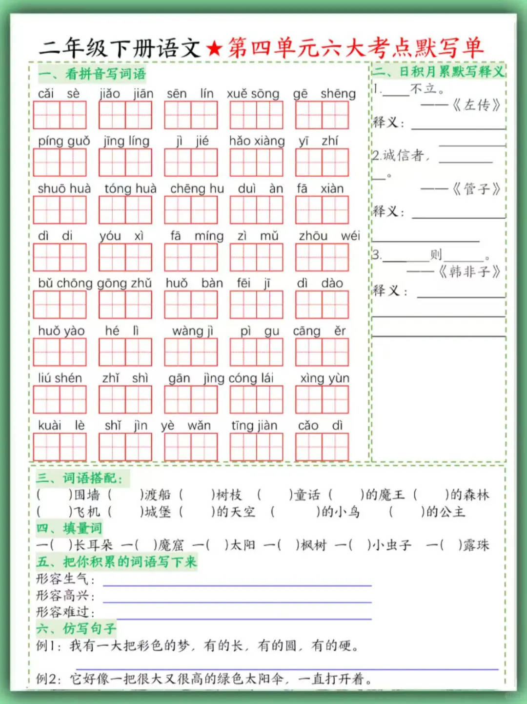 熟悉考试题型:默写单中的题型与二年级语文考试题型相似,学生通过反复练习,能够熟悉考试的出题形式和答题要求,掌握不同题型的解题方法和技巧,在考试中能够更加从容应对,提高考试成绩 。