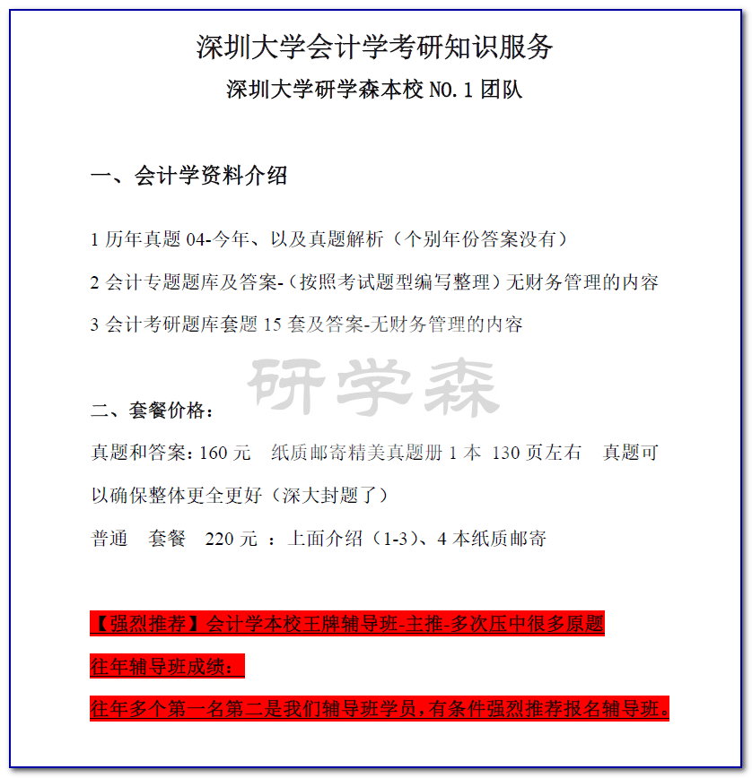 深圳大学会计学考研初试资料和辅导班服务,务必认准【淘宝:深圳大学考研店铺】,市面资料很多,鱼龙混杂,参差不齐,也有很多假冒、劣质资料,不全资料,盗版旧版资料等,希望可以帮到更多的学弟学妹一次性买到一份更好的资料,提高复习效率,最终帮到大家取得更好的成绩上岸