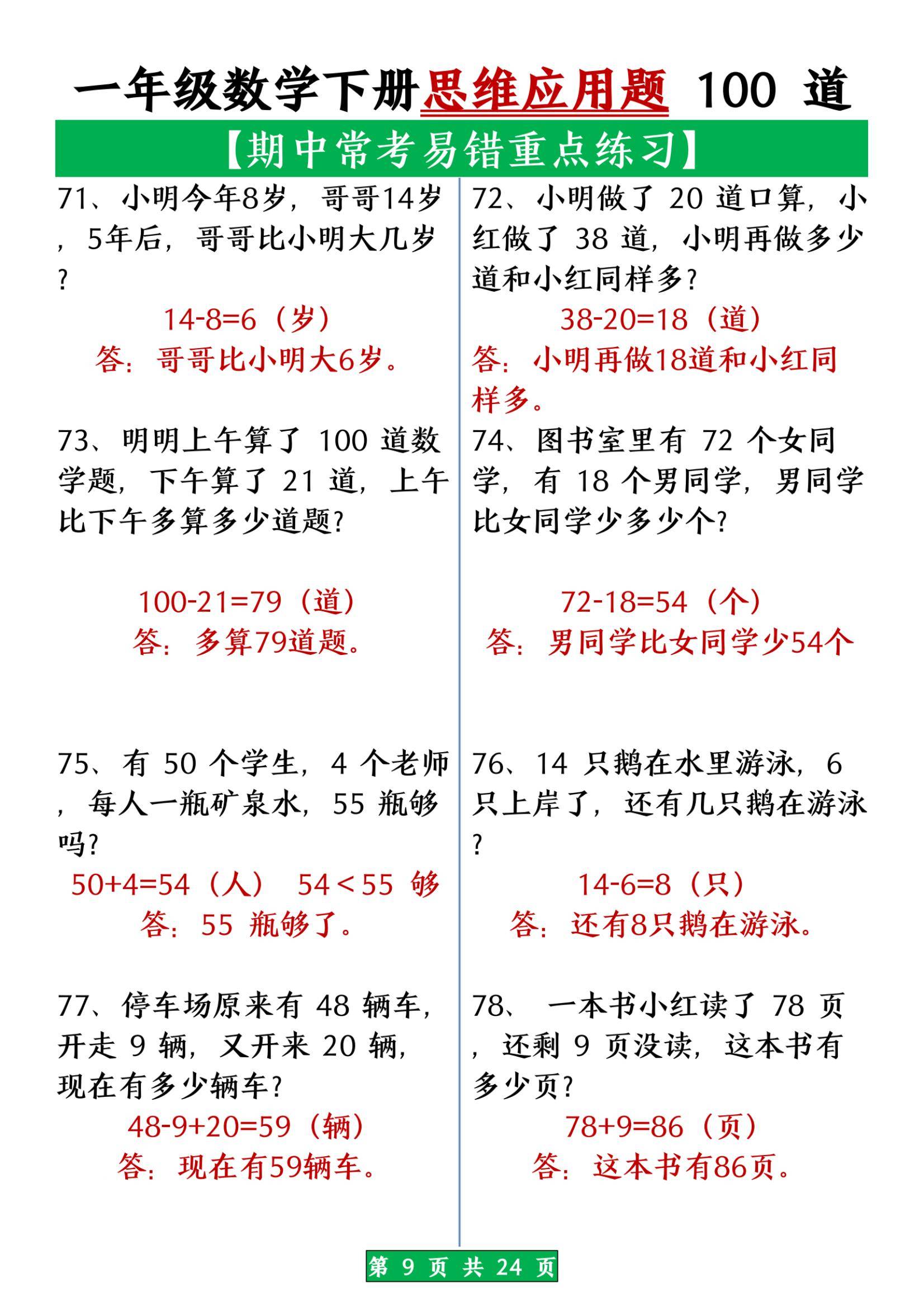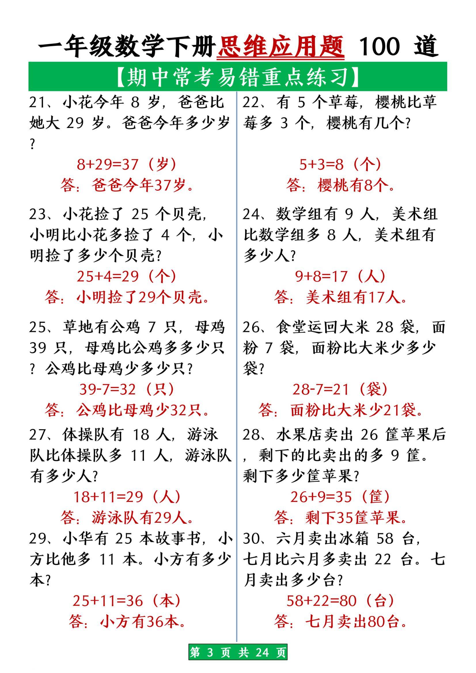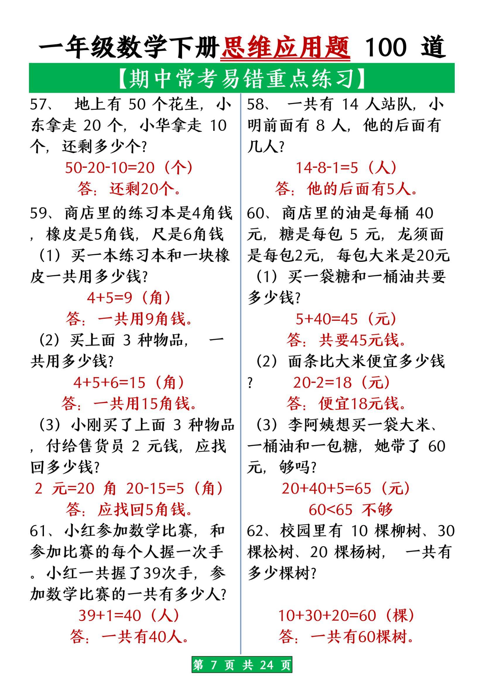 这是一份一年级下册数学思维应用题常考易错100道(含答案),涵盖物品数量的增减、人物数量的比较、价格计算等多种生活场景。通过这些应用题练习,能帮助一年级学生将数学知识与实际生活紧密联系,强化加减法运算能力,提升分析问题和解决问题的思维水平,为后续数学学习奠定良好基础。