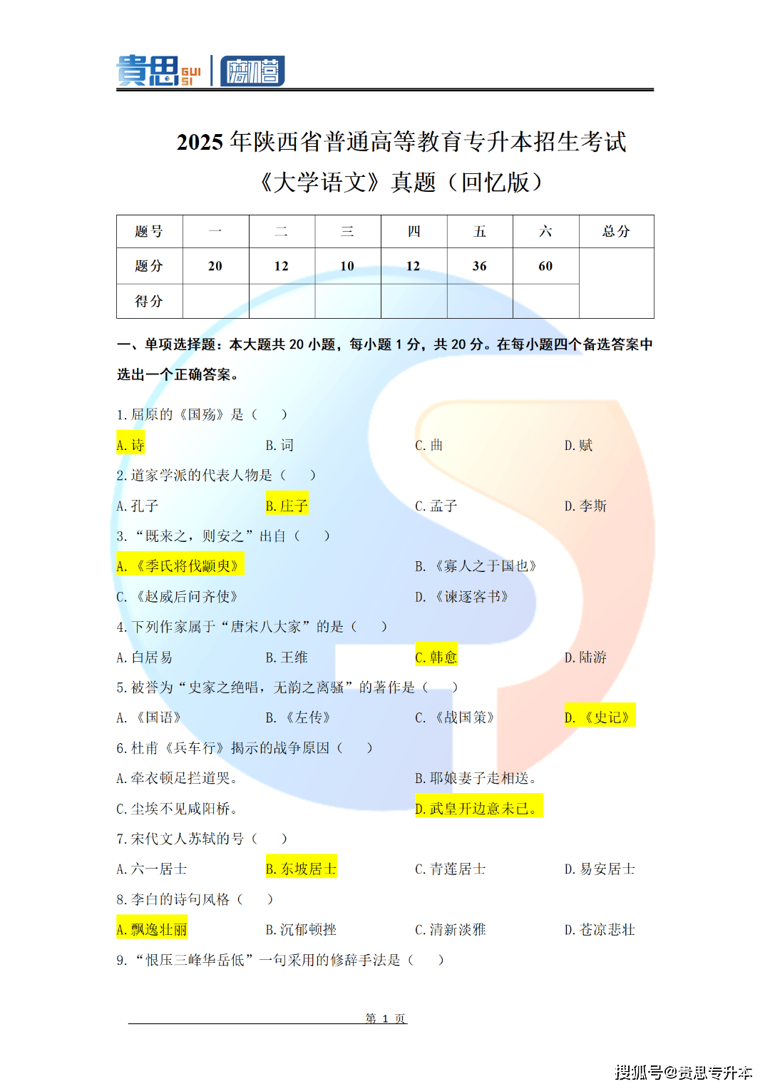2025大学语文真题&答案