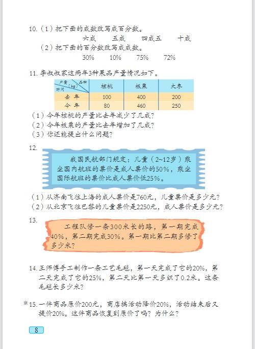 - 折扣:用于商品,现价是原价的百分之几叫折扣,通称 “打折”。几折就是十分之几,即百分之几十。解决打折问题,要先将折数转化为百分数或分数,再按求比一个数多(少)百分之几(几分之几)的数的解题方法解答。