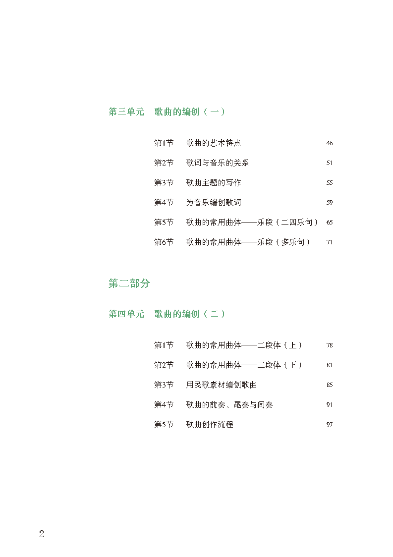 - **第三单元 歌曲的编创**:讲解歌曲的艺术特点、歌词与音乐的关系、主题写作、常用曲体等,培养学生歌曲编创能力。
