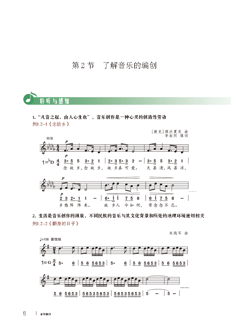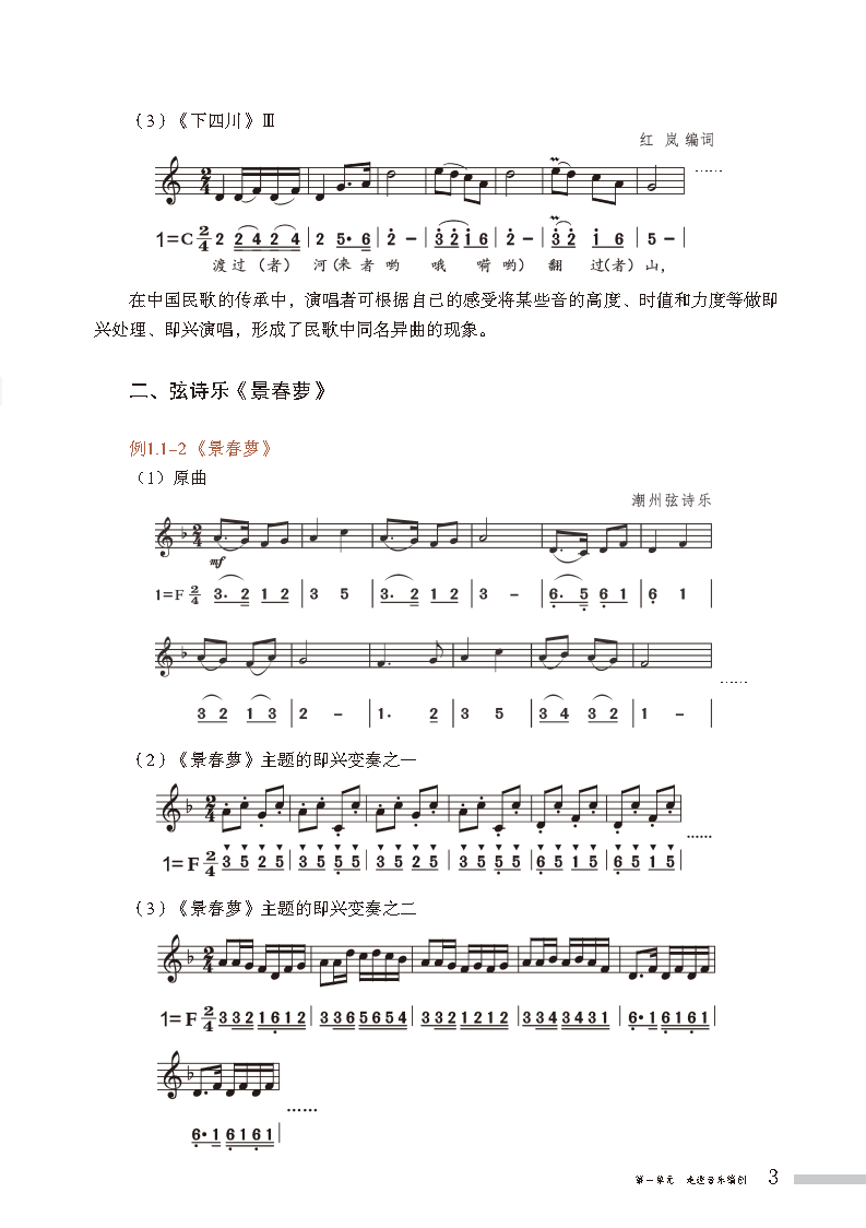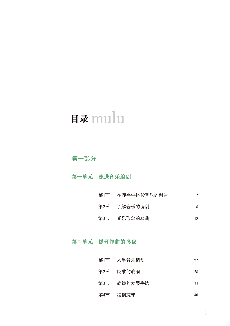 - **第二单元 揭开作曲的奥秘**:涉及音乐编创的入手方法、民歌改编、旋律发展手法及编创旋律等,让学生逐步掌握作曲的基本技巧。
