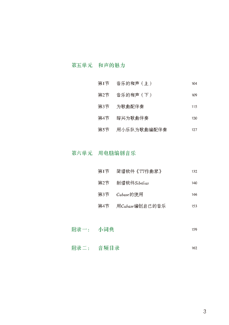 - **第五单元 和声的魅力**:介绍音乐和声知识,包括为歌曲配伴奏、即兴伴奏及用小乐队编配伴奏等,丰富音乐编创的表现形式。