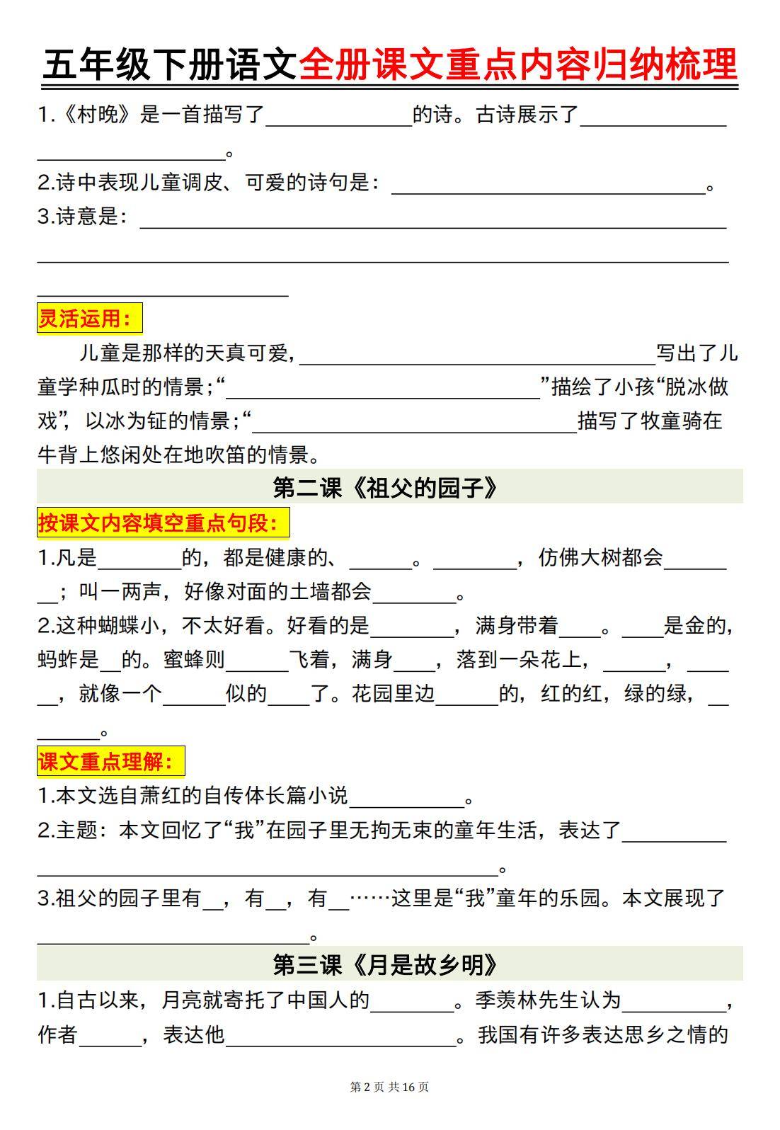 今天为大家分享:五下语文全册课文重点内容归纳梳理空白16页,按课次梳理,涵盖古诗词(字词解释、诗意、情感 ),如《古诗三首》;现代文(作者、出处、主题、重点句段理解、人物性格归纳 ),如《祖父的园子》等;名著选段(故事背景、情节、人物形象 ),如《草船借箭》等;还有综合性学习内容(汉字相关知识 )。
