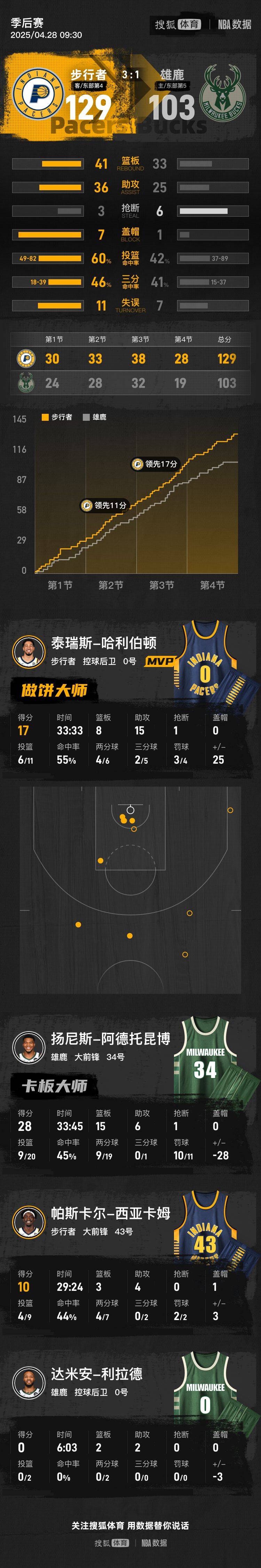 【搜狐体育战报】北京时间4月28日NBA季后赛首轮G4,客场作战的步行者以129-103击败雄鹿,总比分3-1领先,拿到赛点。哈利伯顿17分8篮板15助攻,阿德托昆博28分15篮板6助攻。