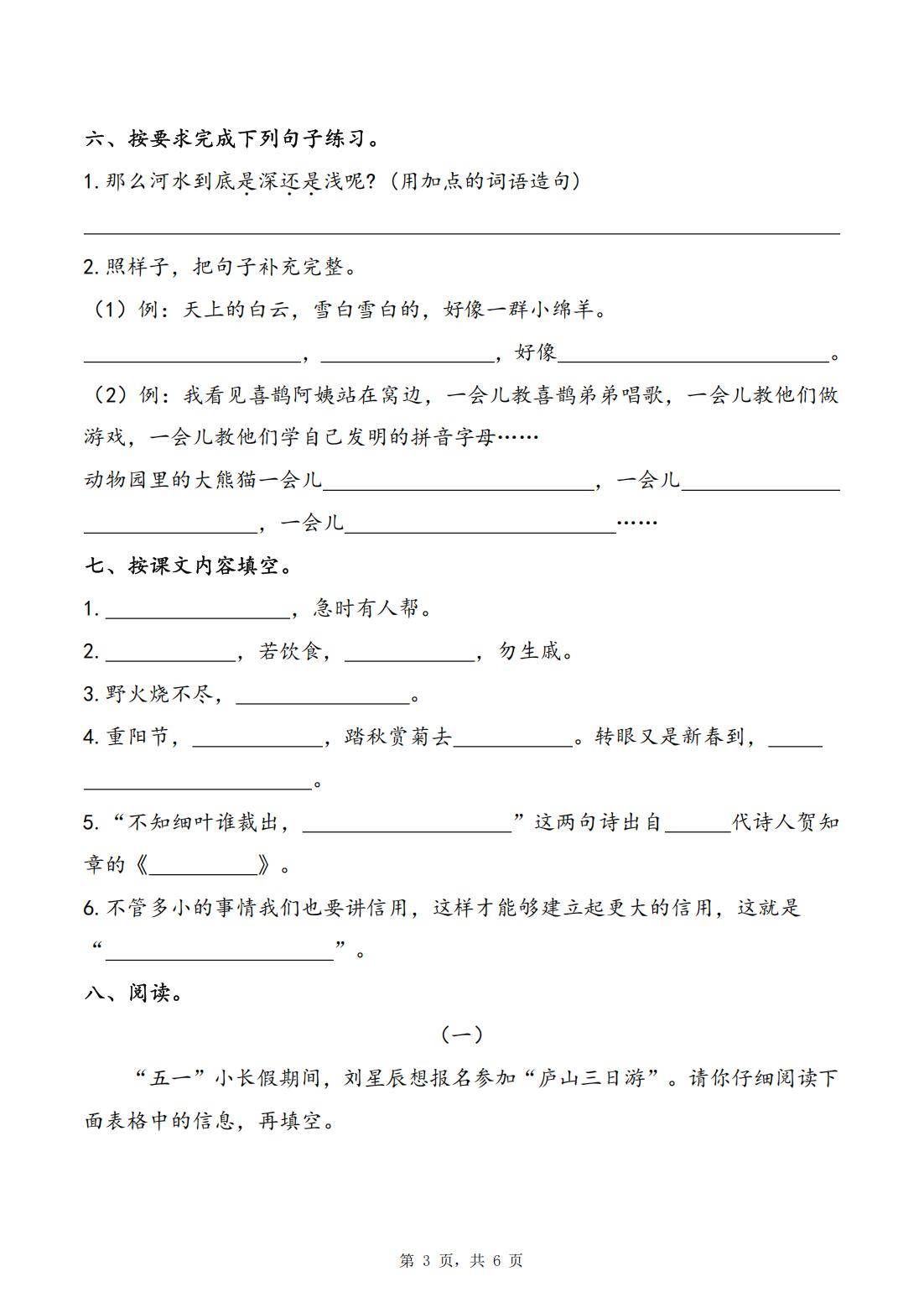 今天为大家分享:二下语文五一假期练习(含答案6页),涵盖字词基础,包括字音选择、看拼音写词语、生字分组、变新字组词 ;词语运用,有填量词、仿写词语、选词填空等;句子练习,涉及造句、补充句子;还有按课文内容填空,考查对课本知识的记忆;以及阅读板块,包含根据信息判断对错和阅读理解短文。