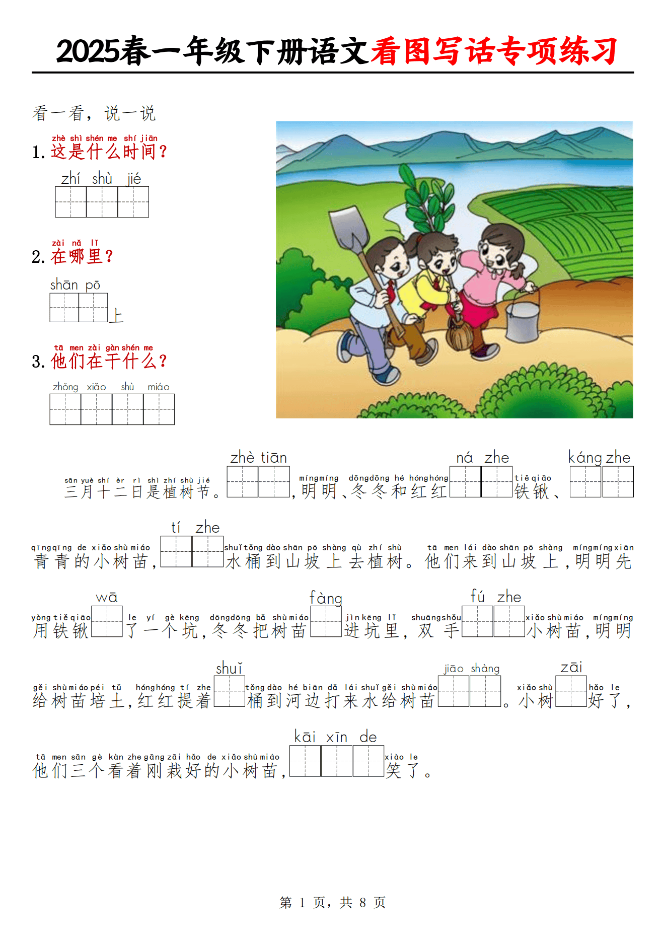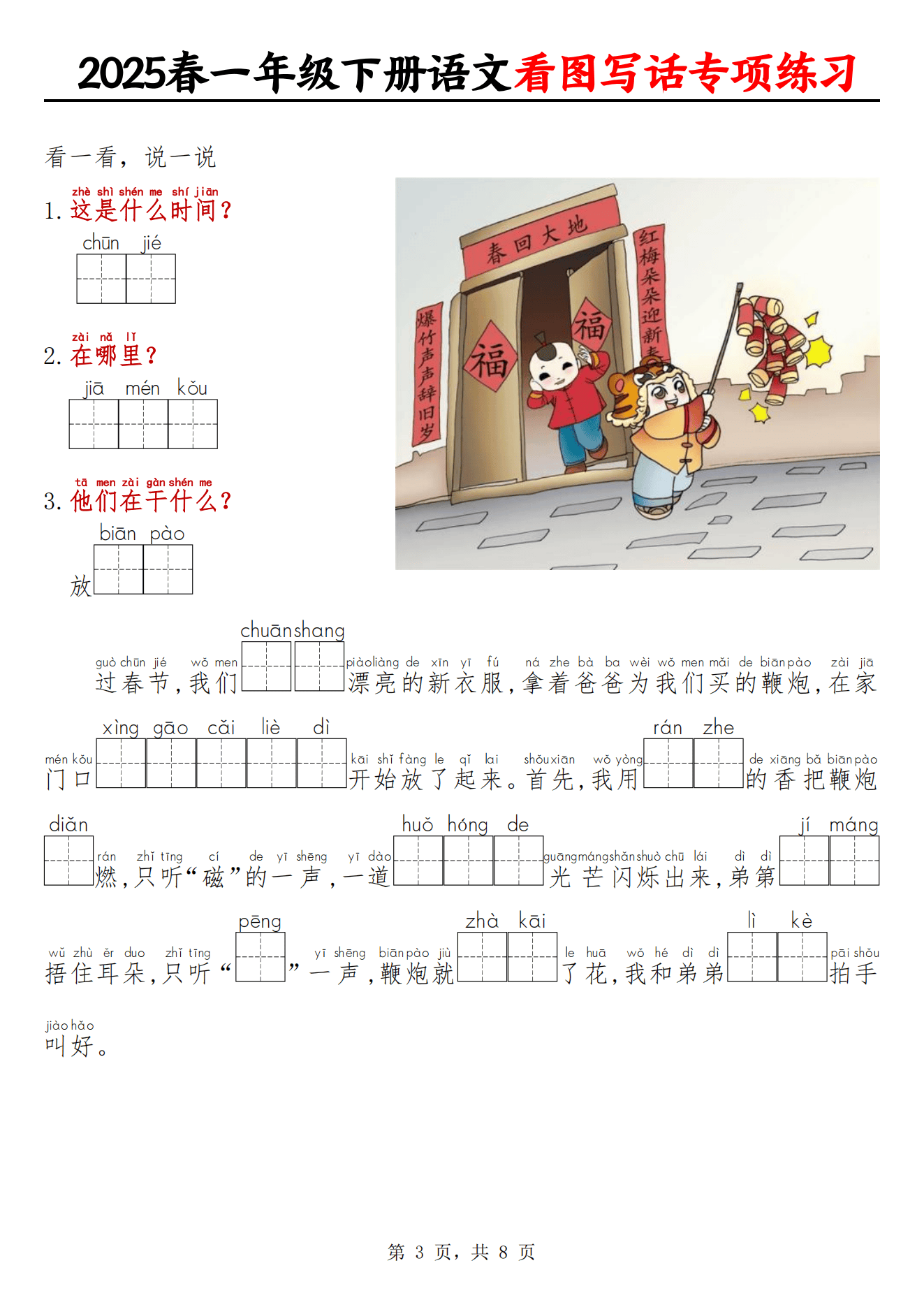 资料通过多幅生动的图片,设置 “看一看,说一说” 和填空写话等环节。引导同学们观察图片中的时间、地点、人物活动等要素,再通过填空的形式组织语言,完成写话练习。掌握看图写话的方法和技巧,为语文学习打下坚实基础。