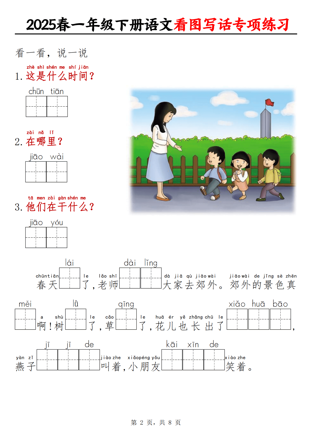 今天给大家分享:在一年级下册语文学习中,看图写话是培养语言表达和观察力的重要环节。这份 “2025 春一年级下册语文看图写话专项练习” 资料,就像一把开启写作之门的钥匙,助力提升看图写话能力。