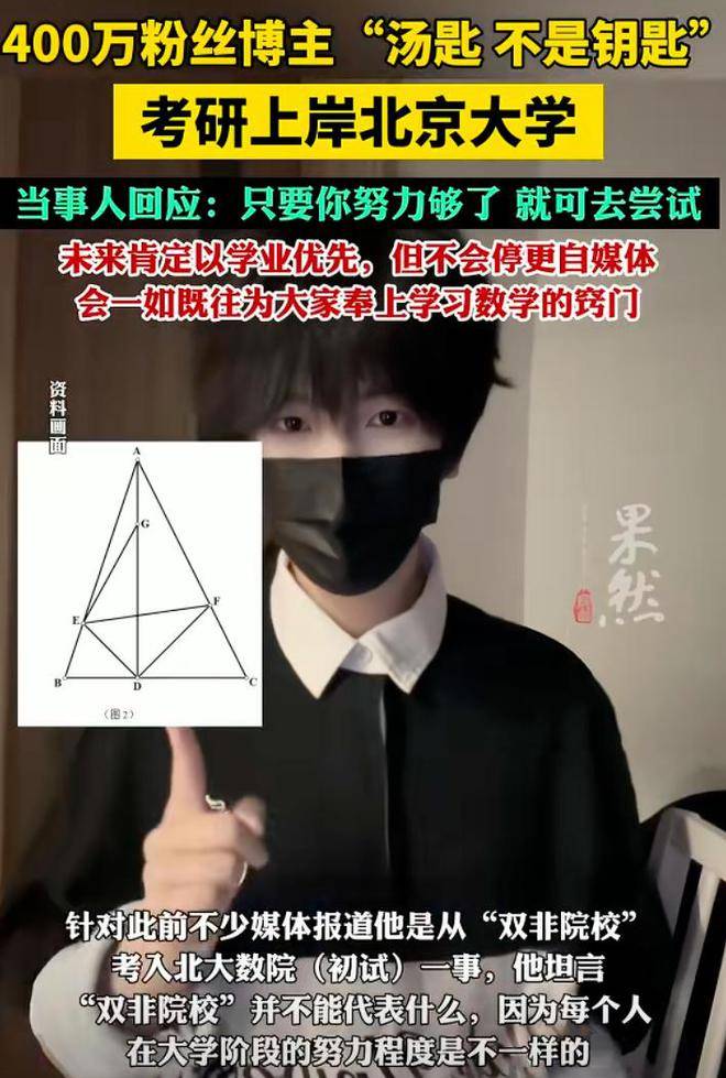 近日,一则“400万粉丝网红‘汤匙不是钥匙’考取北京大学研究生”的消息引发热议。4月26日,博主“汤匙不是钥匙”(本名匙凯歌)在社交平台晒出拟录取通知,称以初试412分、专业排名第二的成绩被北大数学科学学院金融专业录取。4月28日,北大数院工作人员回应称:“学院按招生流程录取,不清楚新生是否为网红,一切以公示名单为准。”