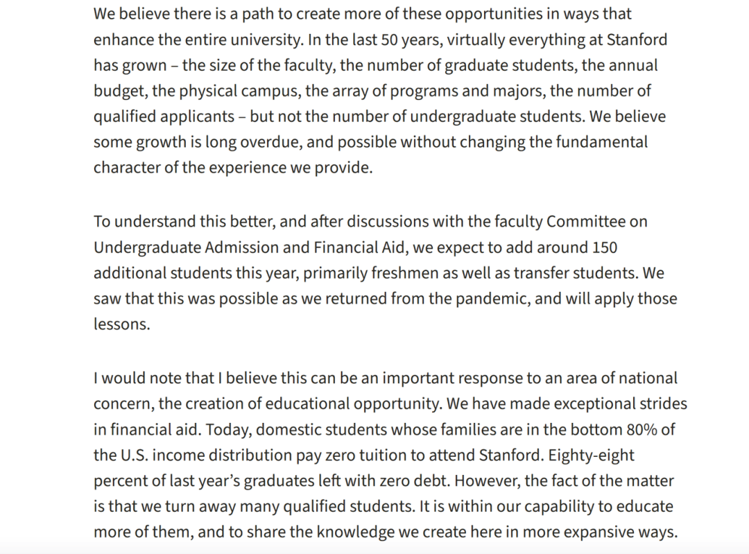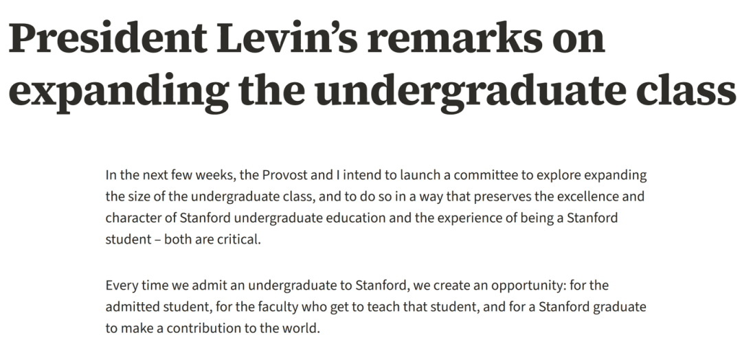 4月10日,斯坦福大学官网发布了公告,校长乔纳森·莱文 (Jonathan Levin)宣布将扩招约150名学生,主要是新生和转学生。