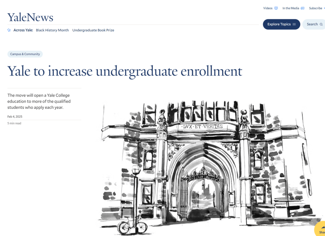 2025年2月,耶鲁大学宣布:自2025年秋季入学起,每年将增加100个本科新生名额,使每届新生规模达到1650人,最终本科入读人数将达到6600人。