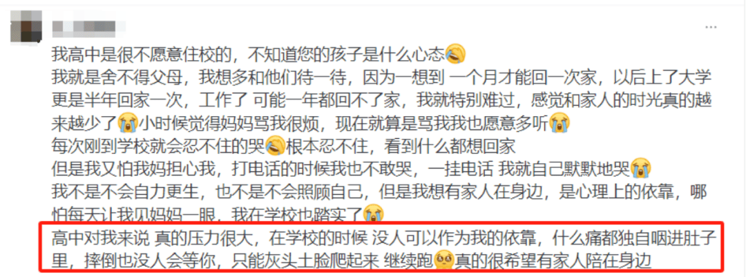“刚到一个陌生的地方,不适应环境,就感觉父母是不爱自己才把自己送去住校……”