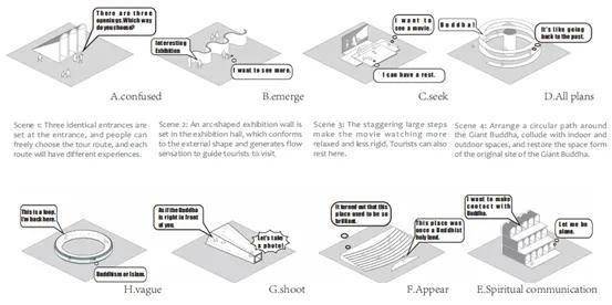 三类人从一进文化中心的大门就面对三个一模一样的窑洞,让文化中心充满了故事性,三条甬道通向不同的功能空间,让行走在流线过程中充满很多不同的体验。最后三股流线在中心汇合,推动到流线的高潮,也就是观景塔上,直面被炸毁的巴米扬大佛遗迹给与三类人同样的冲击感,就如七宗罪电影中最后的一种罪“愤怒”,也是由三个主角一起完成的。