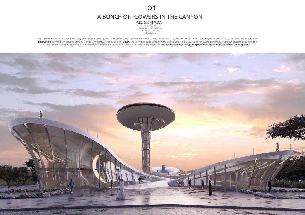 我想介绍一下我的第一个项目:峡谷里的一束花,这个项目主要是以巴米扬大佛被炸毁为背景做的一个文化中心。由于是我第一个项目,我还处于一个从学校的给任务书做设计的思维模式转变的过程,所以我看了很多的竞赛题目以及自己感兴趣的实事热点,但一直是没有找到一个满意的主题。