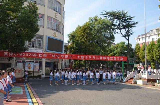 金色秋风拂过校园,鲜艳的红旗迎风招展。9月4日早操集会时间,宁国市西津小学全体师生齐聚操场,举行2025年秋季新学期“铭记与奋斗”主题开学典礼暨师德宣誓活动。仪式在庄严的升旗仪式中拉开帷幕,全体师生肃立注目,少先队员行标准队礼,齐声高唱国歌。