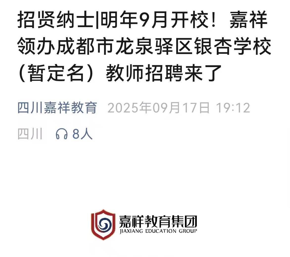 2024年7月,龙泉驿区教育局就已经与嘉祥教育集团签订协议,确定由嘉祥教育集团领办两所新建学校。正在建设中且当时名为银杏东小学和银杏西中学的义务教育段公办学校。