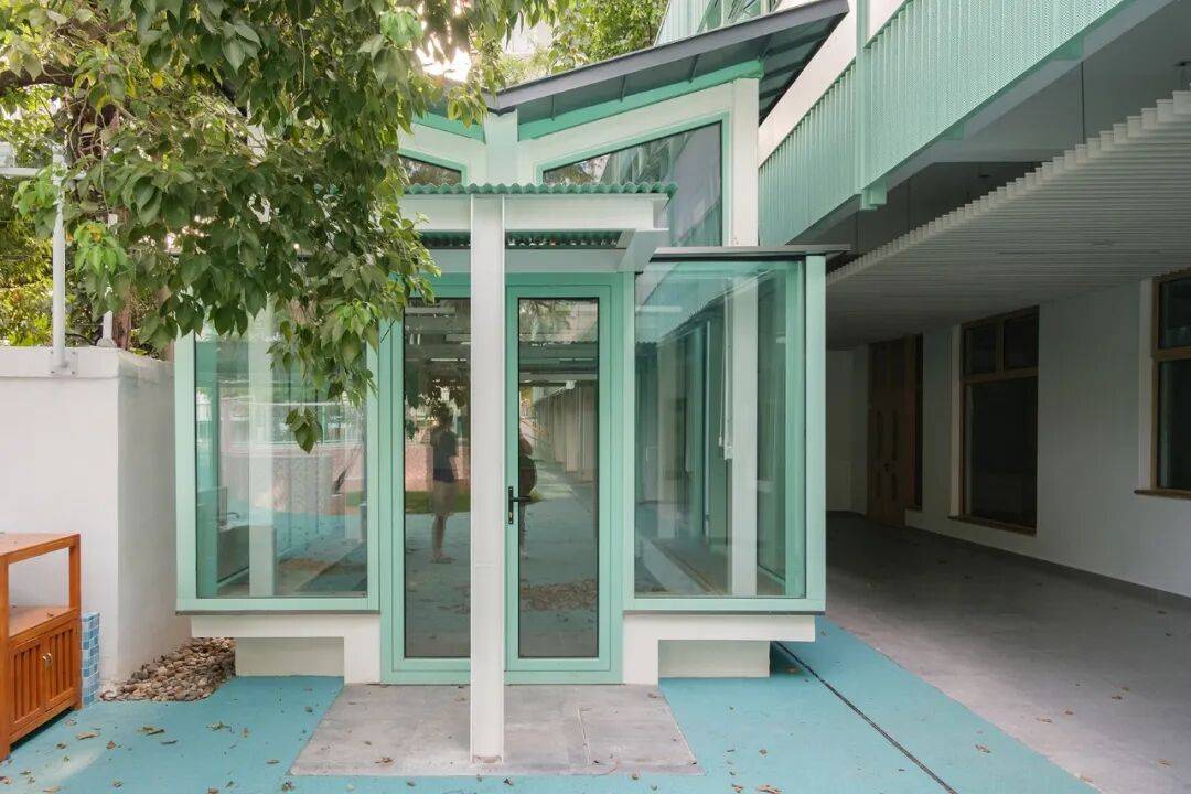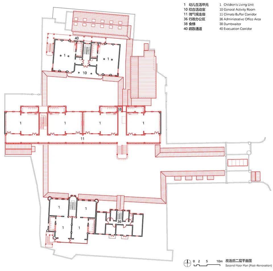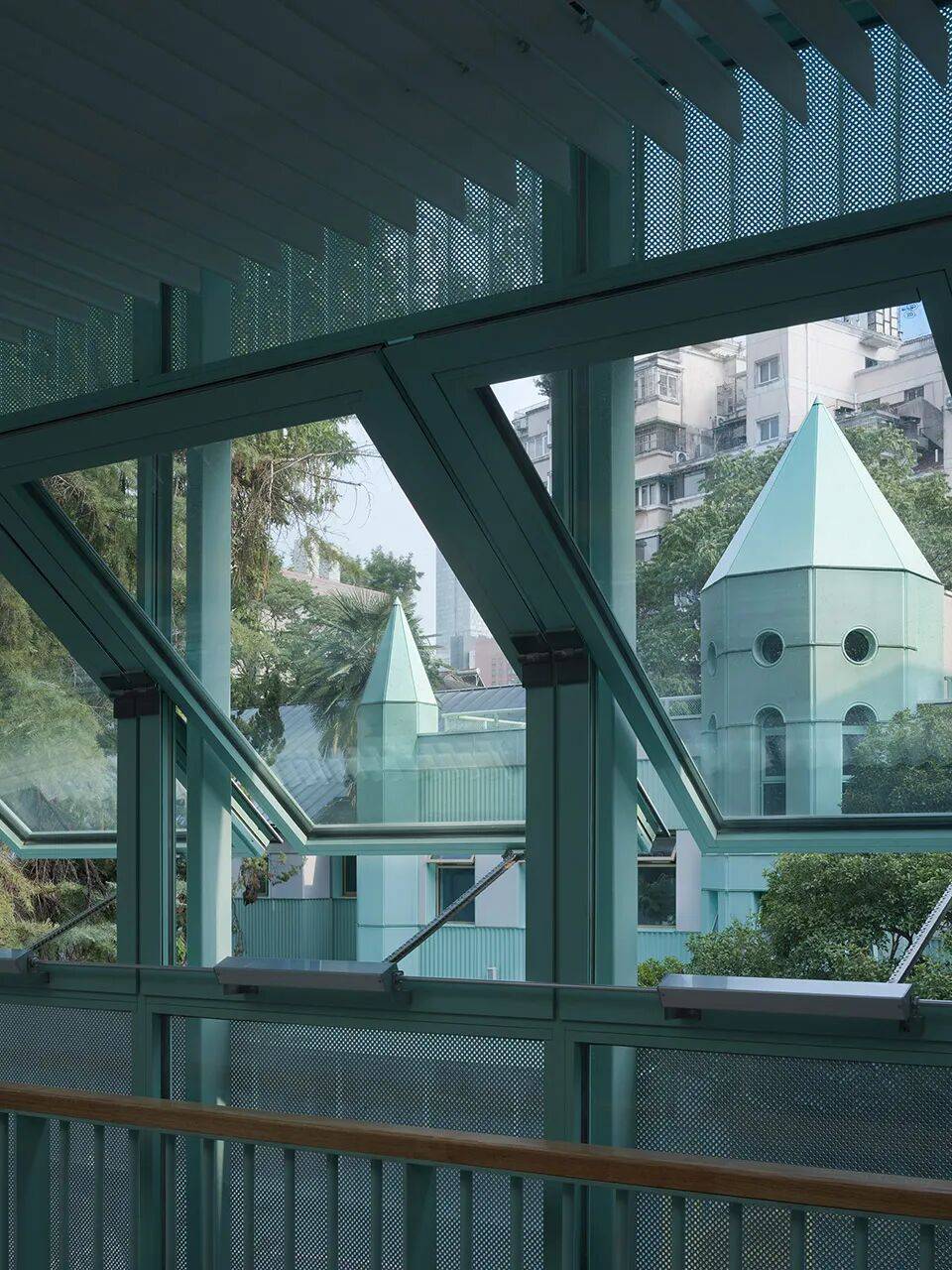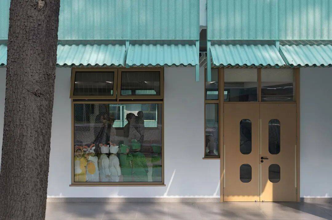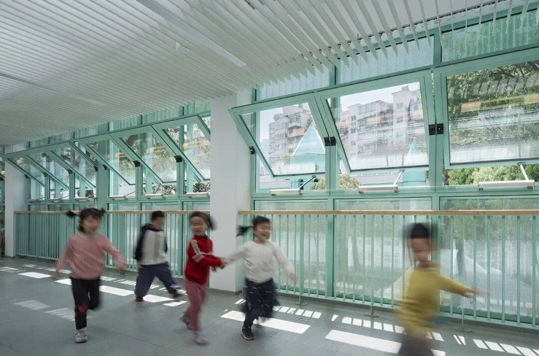 将2号楼2层外走廊从1.2米净宽的挑廊,拓宽至2.8米至3.2米宽的柱廊,使其既符合幼儿园疏散要求,又可额外作为生活单元活动空间的延伸。该走廊外侧采用半封闭围护界面,可作为生活单元的气候缓冲空间。走廊立面、屋面设有纵贯整个空间的中悬窗和天窗,通过其开闭,可对走廊内的微气候进行调节。夏季,开启悬窗和部分天窗,可获得良好的通风;反之,冬季可产生“暖廊”效应。天窗设置在靠生活单元一侧,可补充室内采光,走廊吊顶的铝合金垂片将天窗采光调节成柔和的光线。另外,调整生活单元的开间划分和楼梯间的位置,将原本位于2号楼中部的楼梯调整为东、西侧各一部,以满足疏散规范要求。两部楼梯分别位于走廊内、外侧,以适应不同的气候情况,并且与园区风雨连廊系统相衔接。