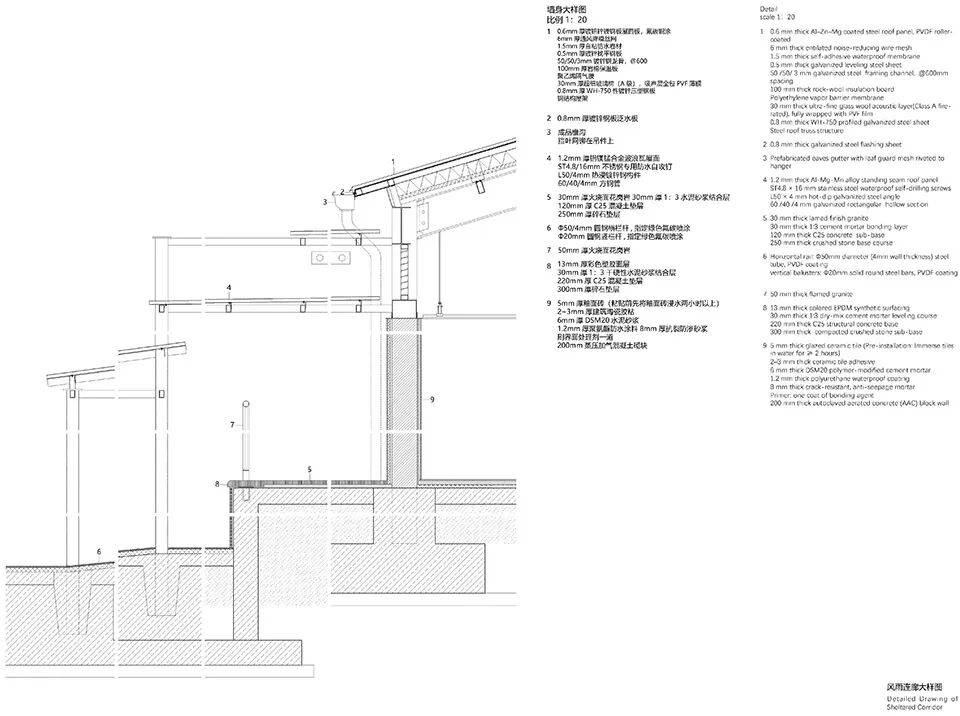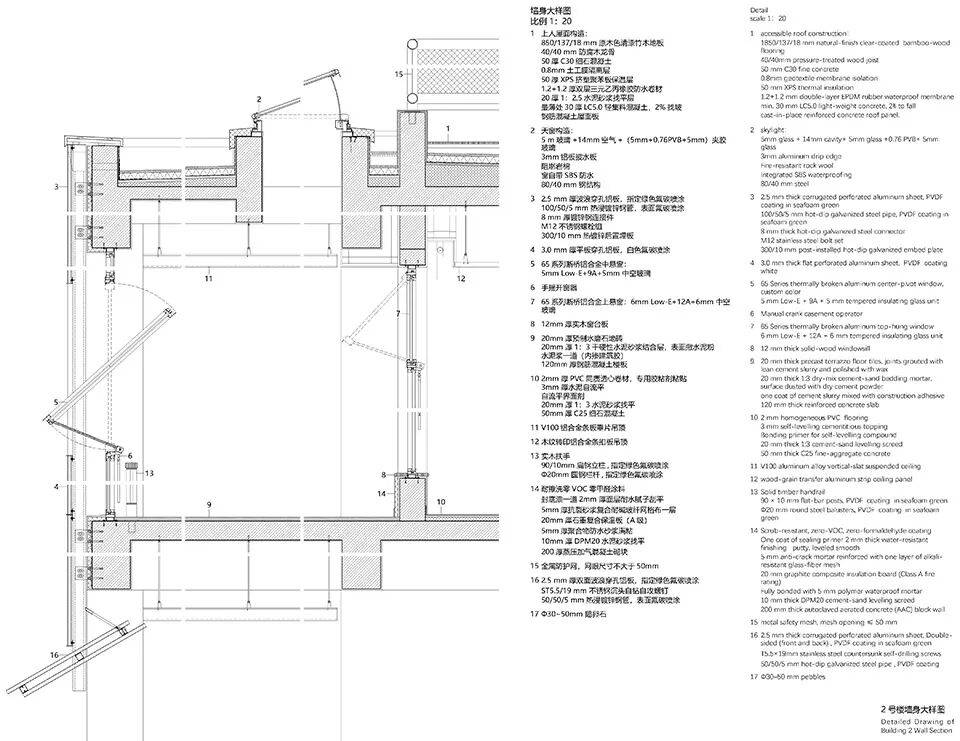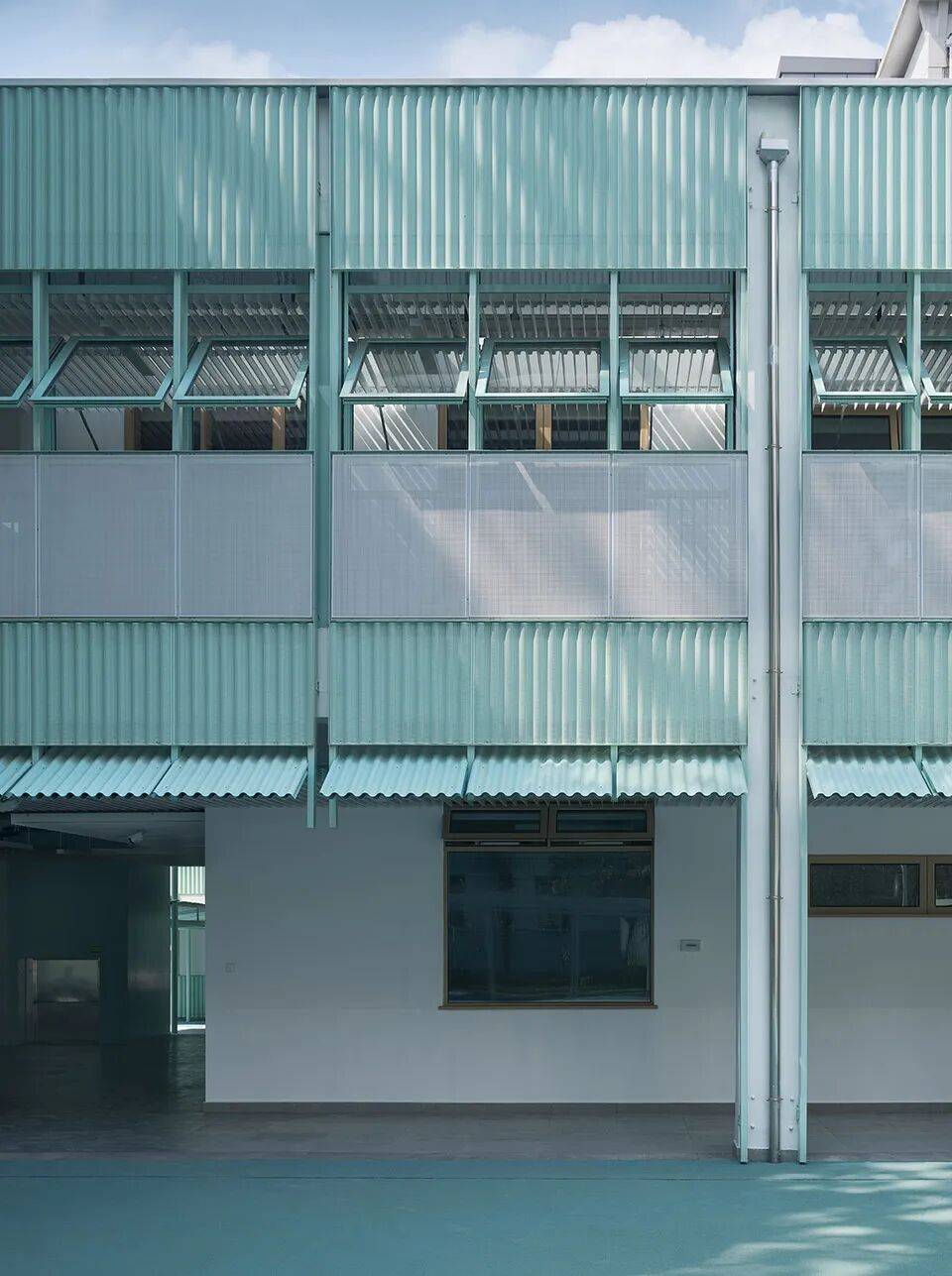 1、2、3号楼朝向主要活动场地的立面,采用穿孔铝板幕墙,赋予主要空间界面视觉连续性,并与风雨连廊的金属波浪板屋面相呼应。