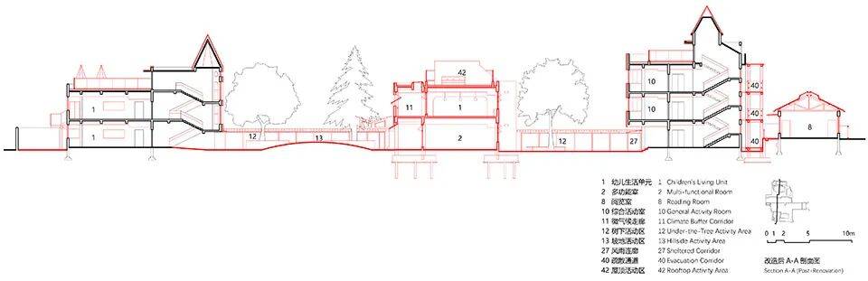 如上所述,在对现实问题的不断应对和解决中,建筑师主动或被动地对空间和构架进行“合”与“分”的处理,并对空间尺度不断做出调节。从而,园区整体呈现出“由局部相互接续所形成的连续空间”,兼具局部场所(place)的稳定感、归属感,与整体空间(space)的流动性、自由感。建筑师相信,这种环境的多义与可读,可以成为幼儿对世界认知的原初风景。