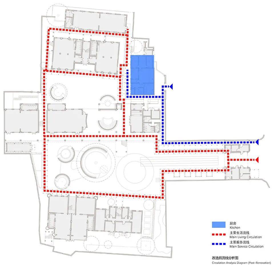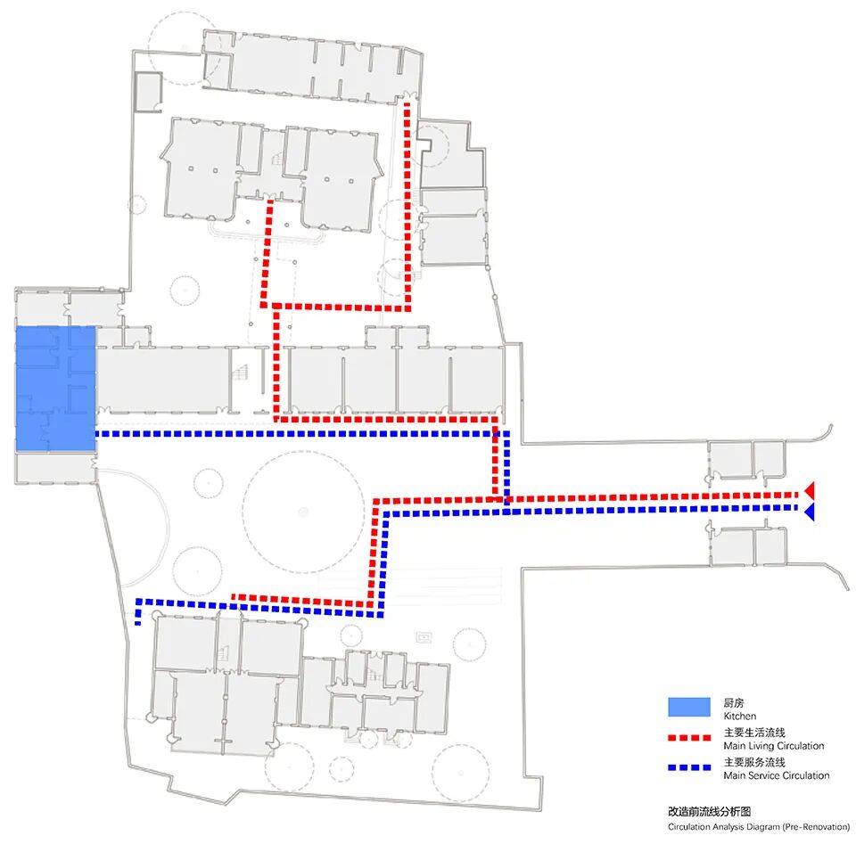 改造前的园区空间布局中,厨房、非机动车停车等服务性功能被安排在园区西侧边缘,与东侧入口距离很远,货运、停车等服务流线须东西向穿越整个园区,导致物流、人流交叉,流线组织混乱。