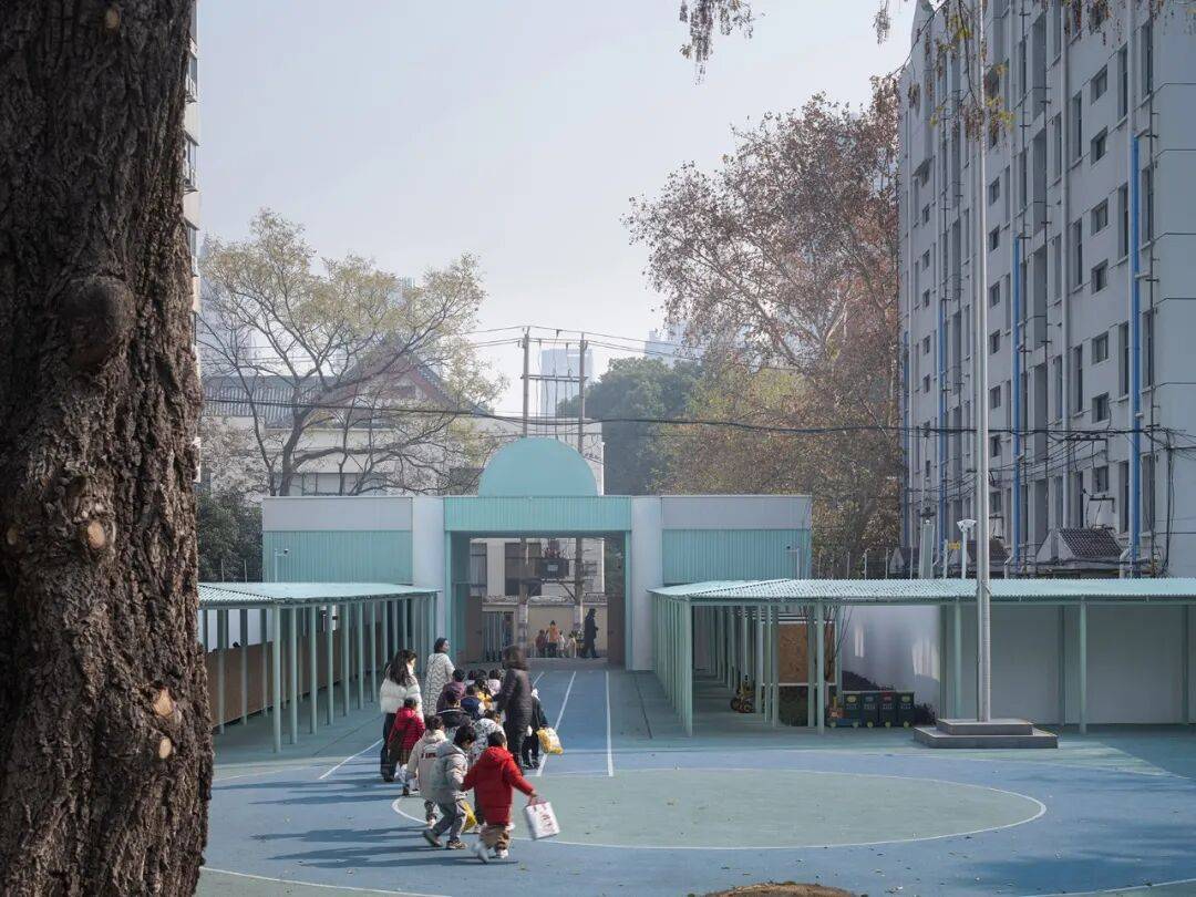 2号楼南侧巨大的枫杨树,对于该园具有重要的精神性意义。从平仓巷主入口进入园区,正对高大枫杨树的景观,具有纪念性意味。改造后,入口门厅空间将进一步开敞,而入园过渡空间的宽度由两侧风雨连廊的限定而收窄,再加上风雨连廊的对称性,以及地面上跑道的导向性,都强调了这一空间序列。
