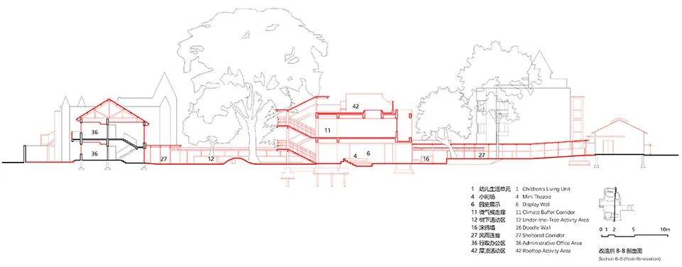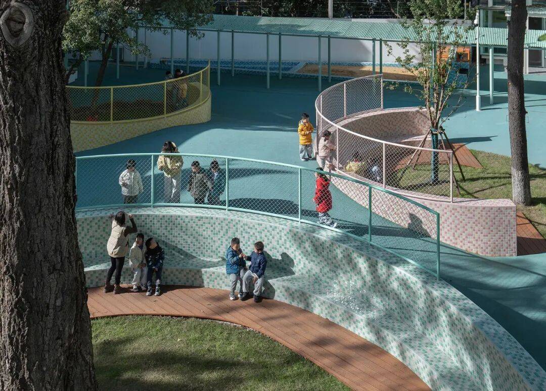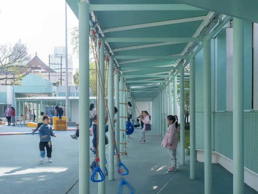 原来园区边缘的消极地带,由于风雨连廊的串联和限定而变得积极,设置了水池、沙坑、种植和饲养园地等自然教育场地。风雨连廊可以被视为有覆盖的活动场地,其构架可以作为附加活动设施的“支撑体”。