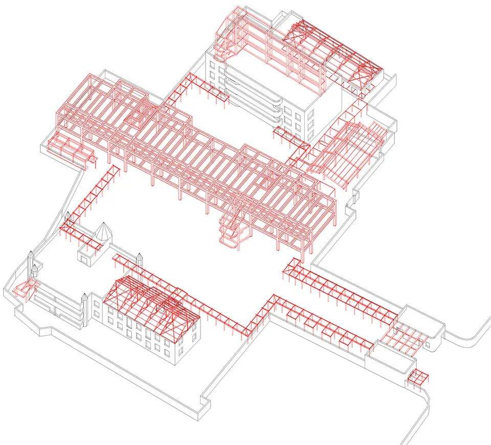 原“科学室”、4号楼为砖承重墙、木屋架混合结构房屋。本次改造在加固砖砌体结构的同时,将木屋架替换为钢屋架。“科学室”屋面增设天窗,使之适用于阅览、美术等教学内容。“科学室”东、南侧在原有檐口以下增加披檐,与风雨连廊和1号楼疏散通道衔接。
