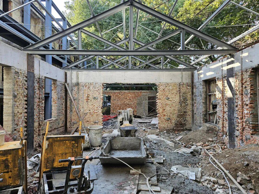 原“建构活动室”、“器材室”为简易搭建的棚屋,已无法继续使用,本次改造中将它们拆除重建。其中,原“建构活动室”替换为钢结构厨房;原“器材室”替换为钢结构教师休息室。