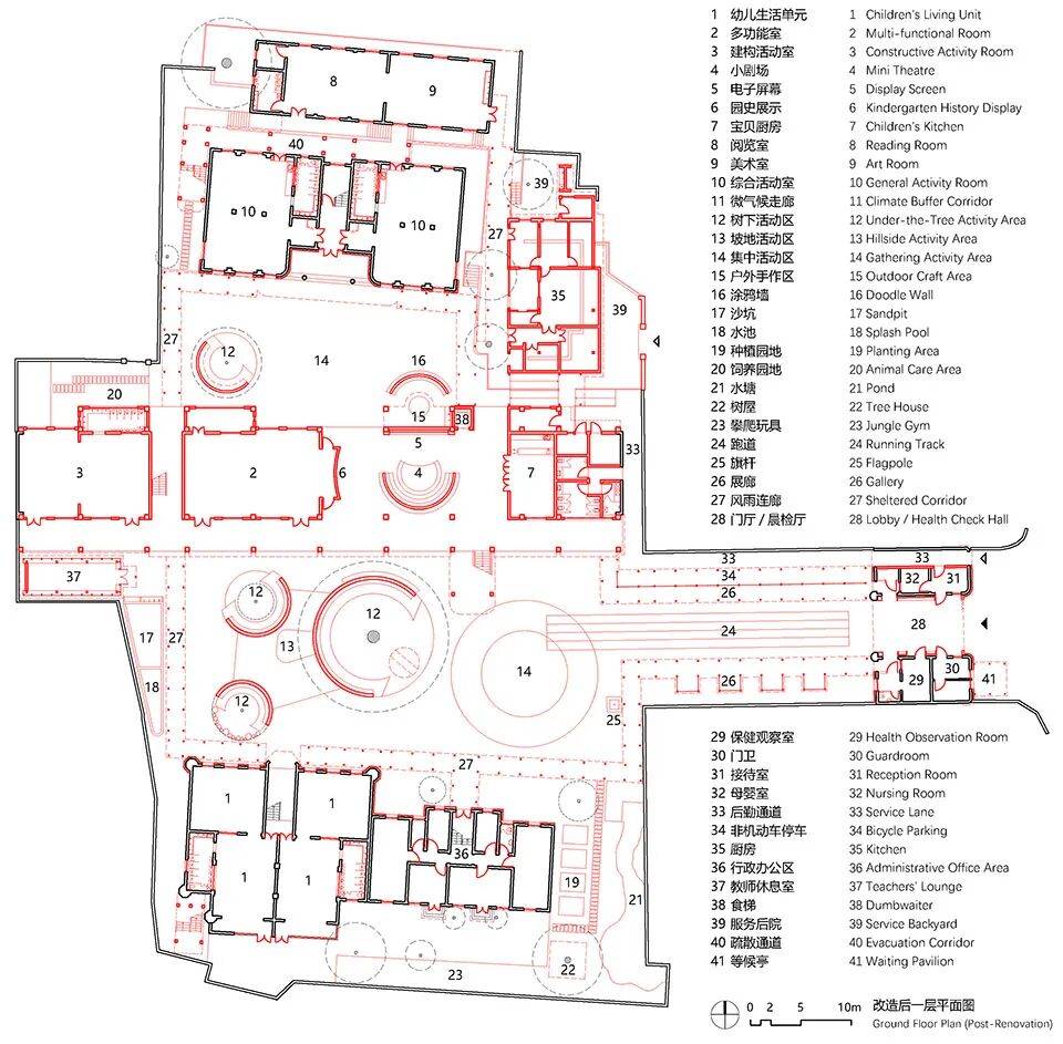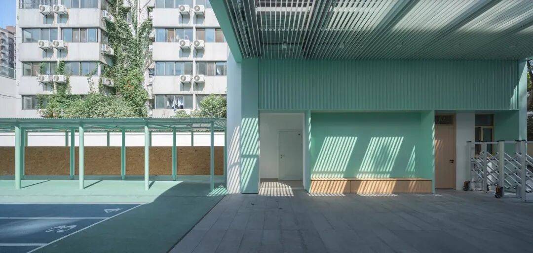 本次改造,首先将厨房从2号楼西侧底层的不利位置调整至园区东侧原“建构活动室”位置,经由沿园区东侧边缘设置的后勤服务通道,与门卫楼新开设的后勤出入口直接联系。由此,避免了后勤服务流线与幼儿生活流线交叉,改造方案通过这一关键性调整启动了整个园区流线的重新组织和空间结构调整。基于后勤服务通道,结合入园空间的风雨连廊北廊,设置了停车棚,方便教工从后勤出入口入园停车。