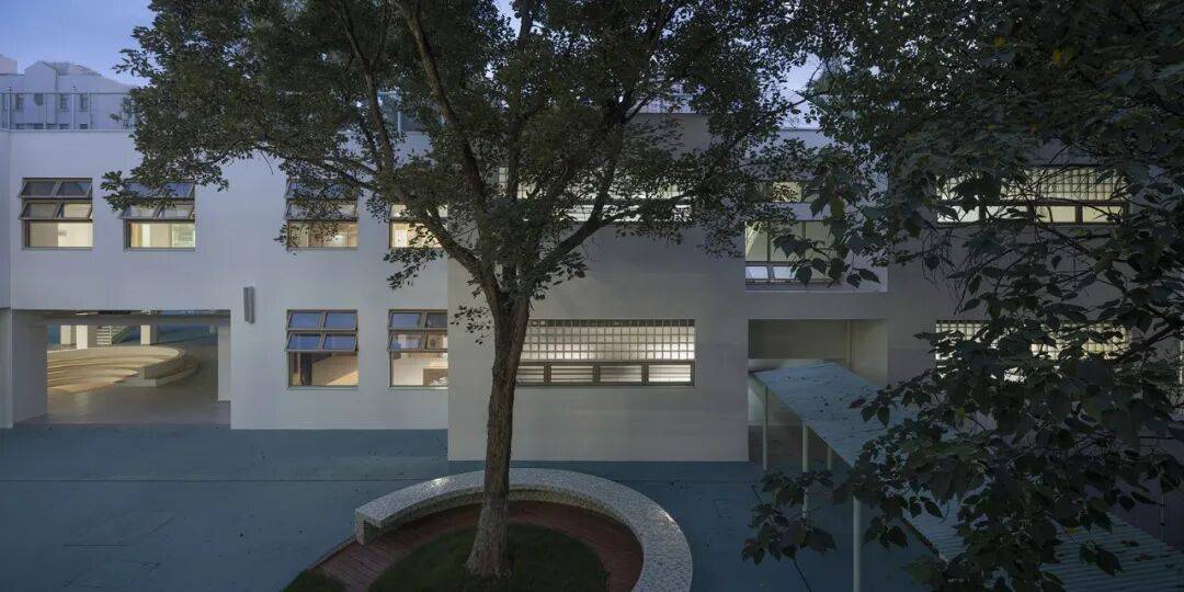 结合园内原有的高大树木,用弧形矮墙围合出尺度不同的树下活动区域。部分建筑渣土被用于填充坡地活动区的人工地形,周边的弧形矮墙正好成为挡土墙。2号楼底层架空空间,设置有下沉的小剧场,其看台外侧的弧形矮墙、西侧多功能室舞台背后的弧形展墙、小剧场屏幕背后户外手作区的弧形涂鸦墙,与各处树下活动区的弧形矮墙,形成了建筑、景观要素之间的关联。