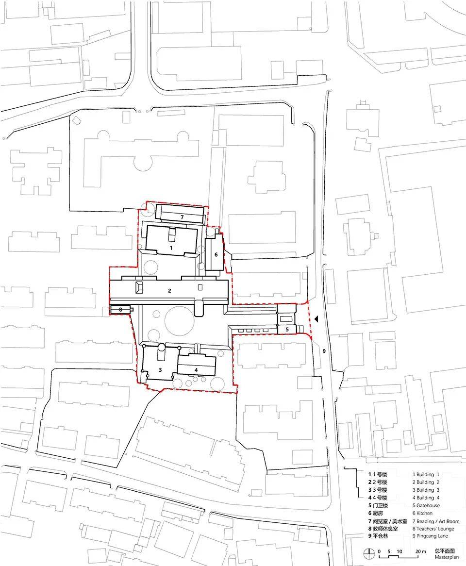 2号楼体量狭长,东、西两端直抵园区边界,将园区拦腰切分为南、北两部分,之间仅能通过2号楼中部通道连通。厨房位于2号楼底层西端,对于主要作为幼儿生活、教学空间的2号楼,有很大的消防安全隐患,同时,其油烟污染对幼儿健康不利。