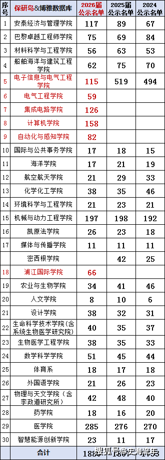 这一变化与学科调整深度相关。电子信息与电气工程学院拆分为4个特色学院后,学科细分优化了名额分配,而人工智能学院因去年刚成立、溥渊未来技术学院首批本科生尚未毕业,暂未产生保研名额,致远学院名额则分散于各学院公示,体现了资源配置的合理性。