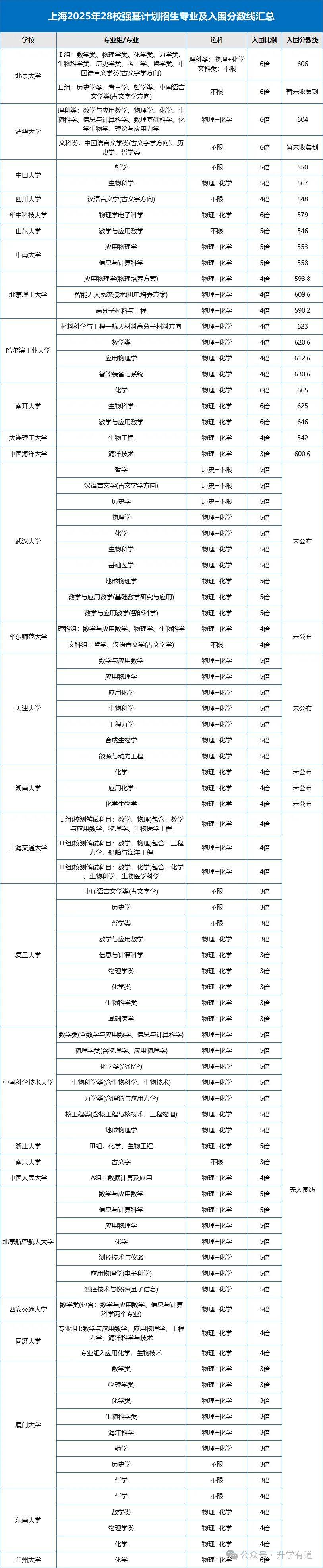 2025年,全国39所有强基招生资格的985高校中有28所高校在上海招生,以下是各校入围分数线: