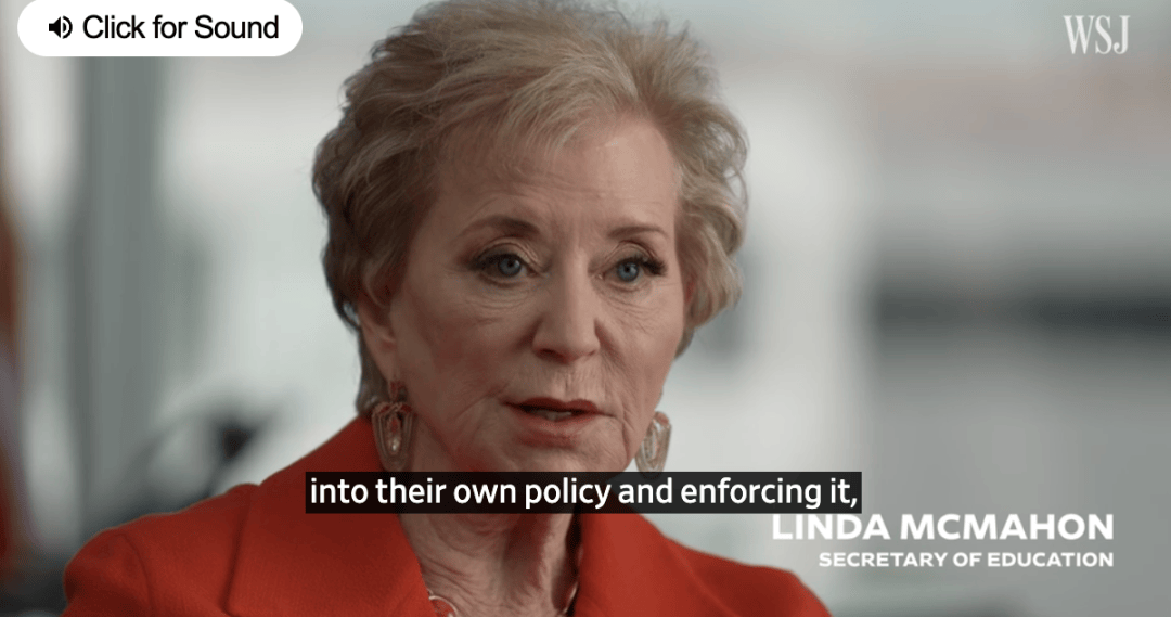 美国教育部长琳达·麦克马洪(Linda McMahon)正领导着特朗普现届政府与美国精英大学展开对抗。目前,哈佛大学已站在这场斗争的风口浪尖。在接受《华尔街日报》专访时,麦克马洪谈及了她认为高校存在的更多问题——比如可能有“恐怖主义”背景的留学生——以及政府施压行动之下是否有妥协的空间。