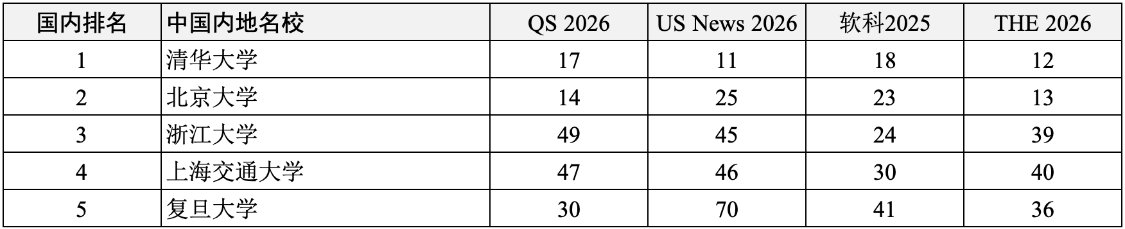 5所中国内地名校进入全部四大主流世界大学排名全球前100名,分别是: