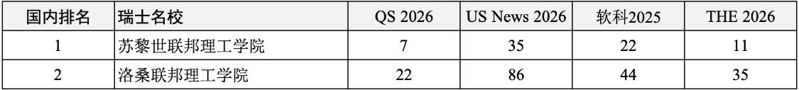 苏黎世联邦理工学院、洛桑联邦理工学院。
