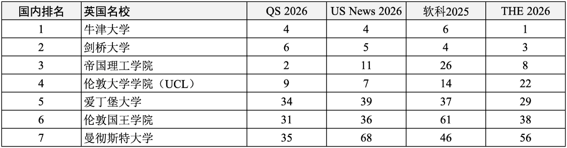 牛津大学、剑桥大学、帝国理工学院、伦敦大学学院(UCL)、爱丁堡大学、伦敦国王学院、曼彻斯特大学。