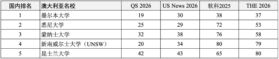 墨尔本大学、悉尼大学、蒙纳士大学、新南威尔士大学(UNSW)、昆士兰大学。