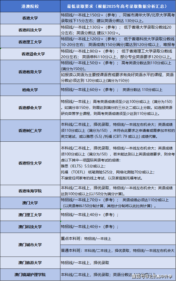 港澳高校高考成绩大多在特招线/一本线40分以上,不同高校分数要求不同,高层次院校香港大学需达到150分以上,香港科技大学需在130分以上,香港理工大学需达到120分以上。