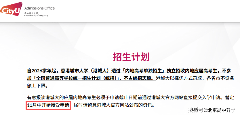 自2026学年起,香港城市大学(港城大)通过「内地高考单独招生」独立招收内地应届高考生,不参加「全国普通高等学校统一招生计划(统招)」,不占统招志愿。港城大以择优方式录取,各省市不设名额上下限。