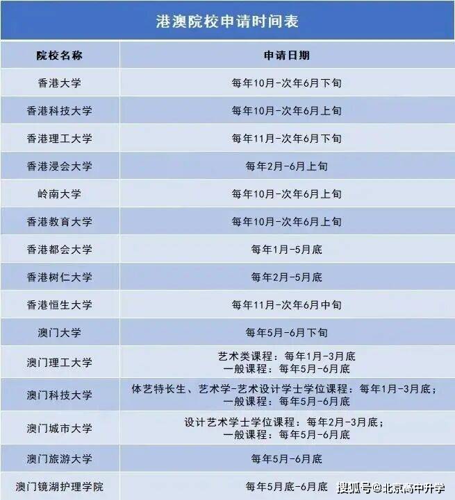 港澳高校一般在每年10月到次年6月进行申请,特整理了重点港澳院校申请日期,供2026届及低年级考生家长参考,详情如下: