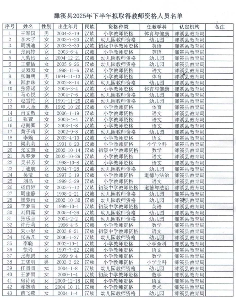 43名在濉溪县教育局申请教师资格证人员符合相应的教师资格认定条件,拟取得相应教师资格。