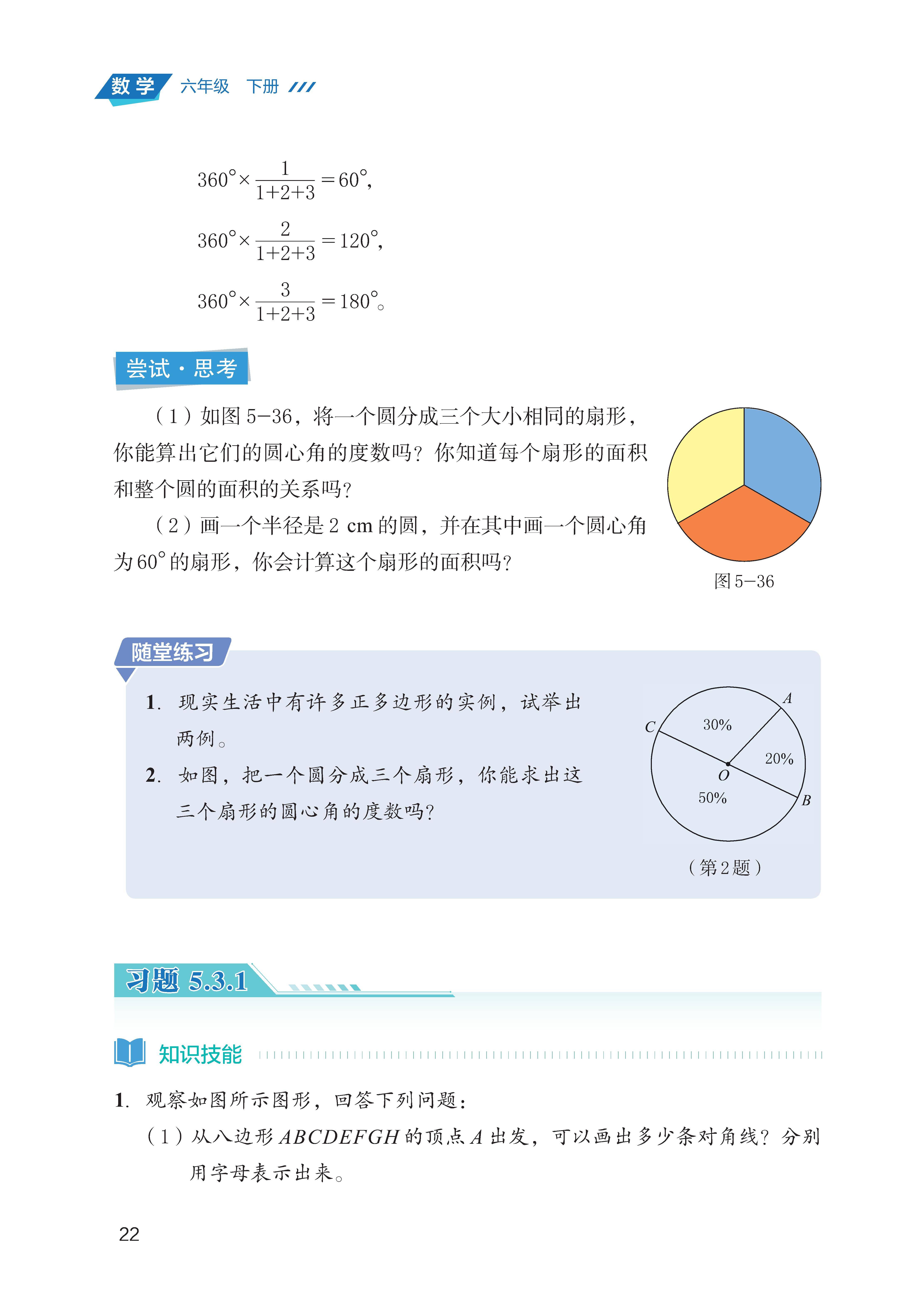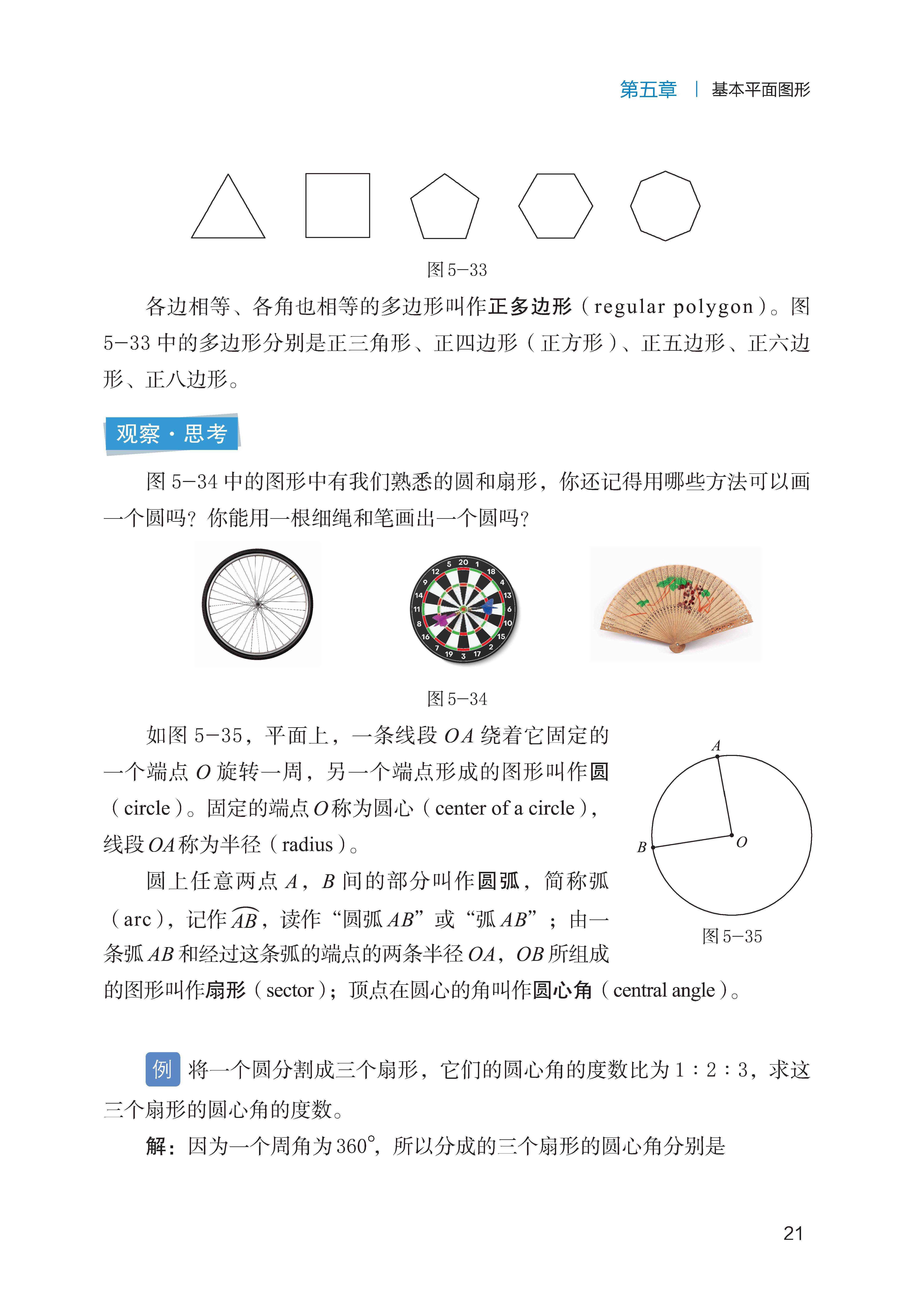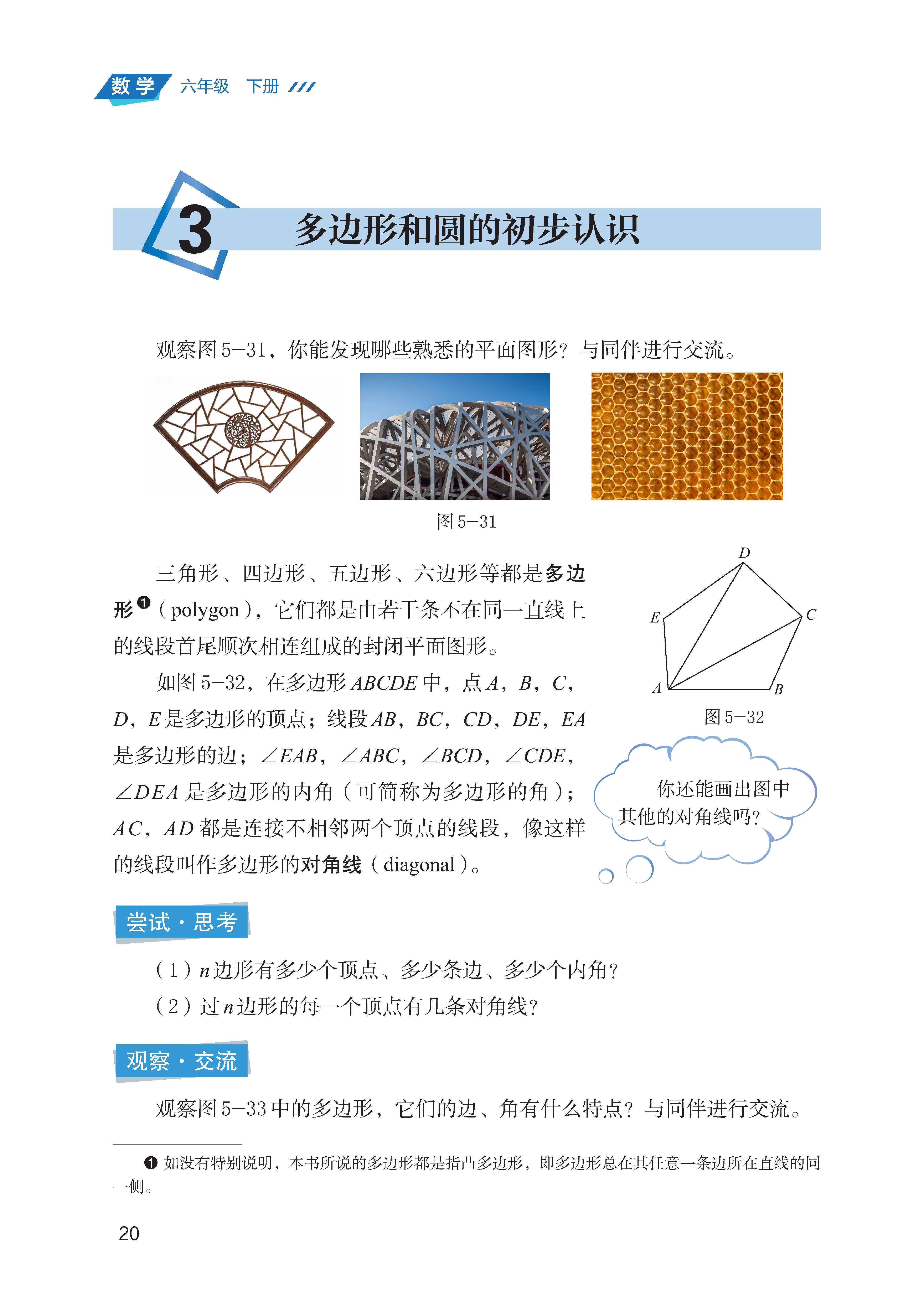基础图形的认知:认识多边形(从边数区分三角形、四边形、五边形等)的定义,了解圆的基本元素(圆心、半径、直径、弧、扇形)。