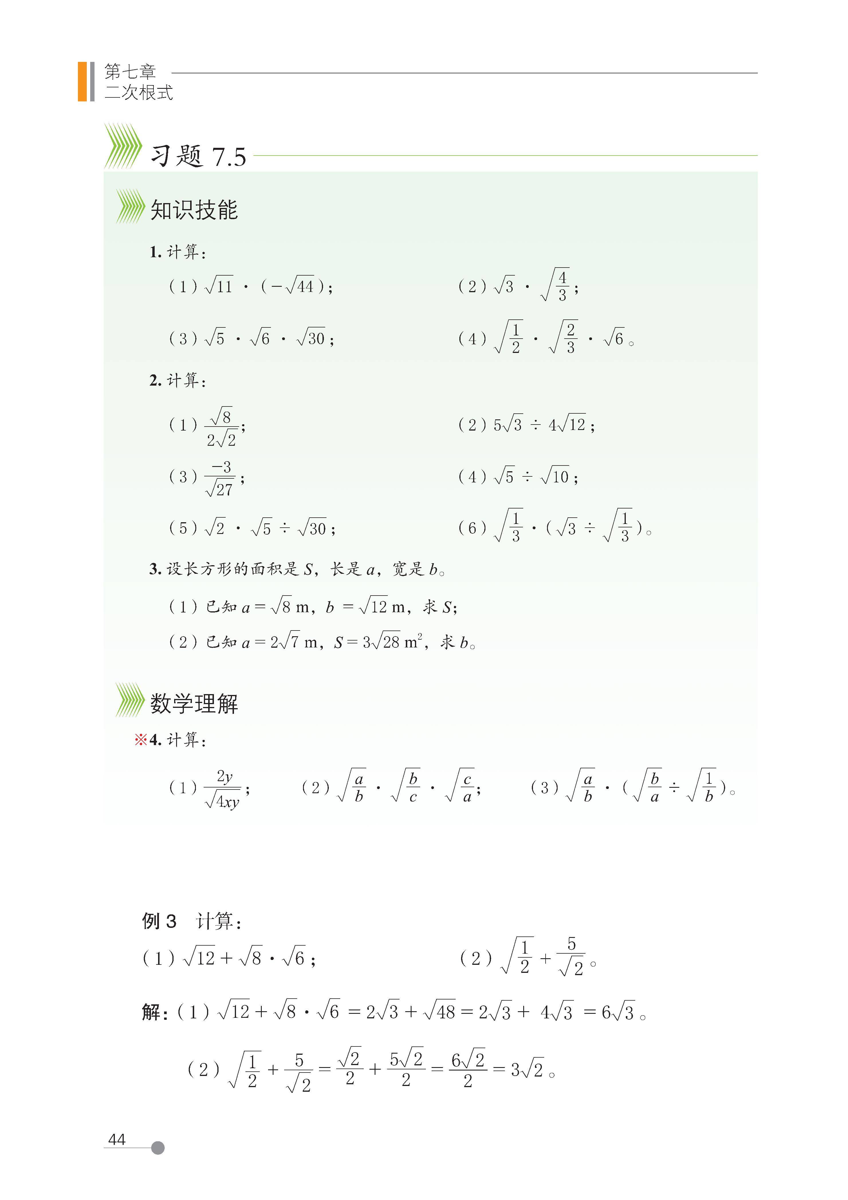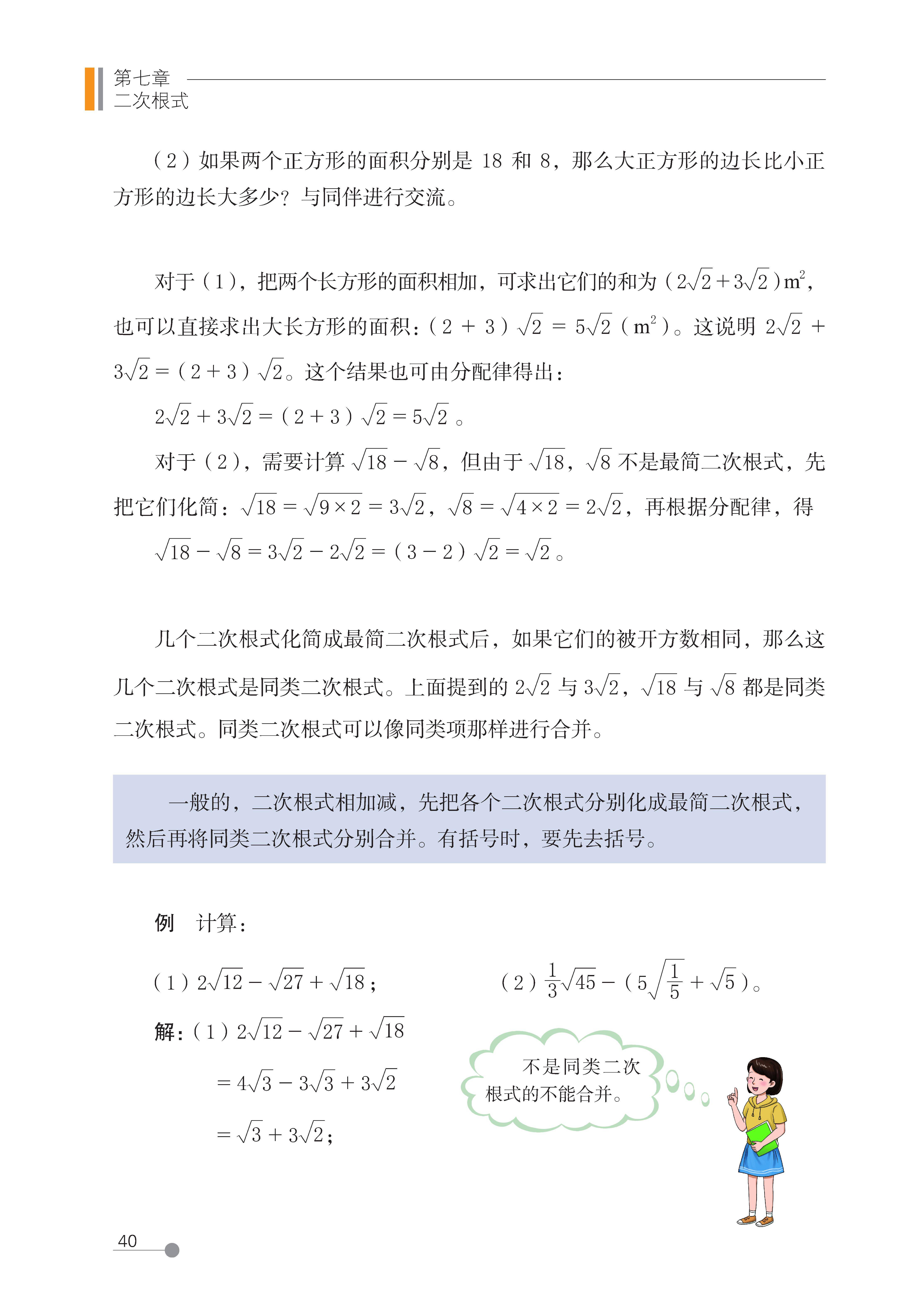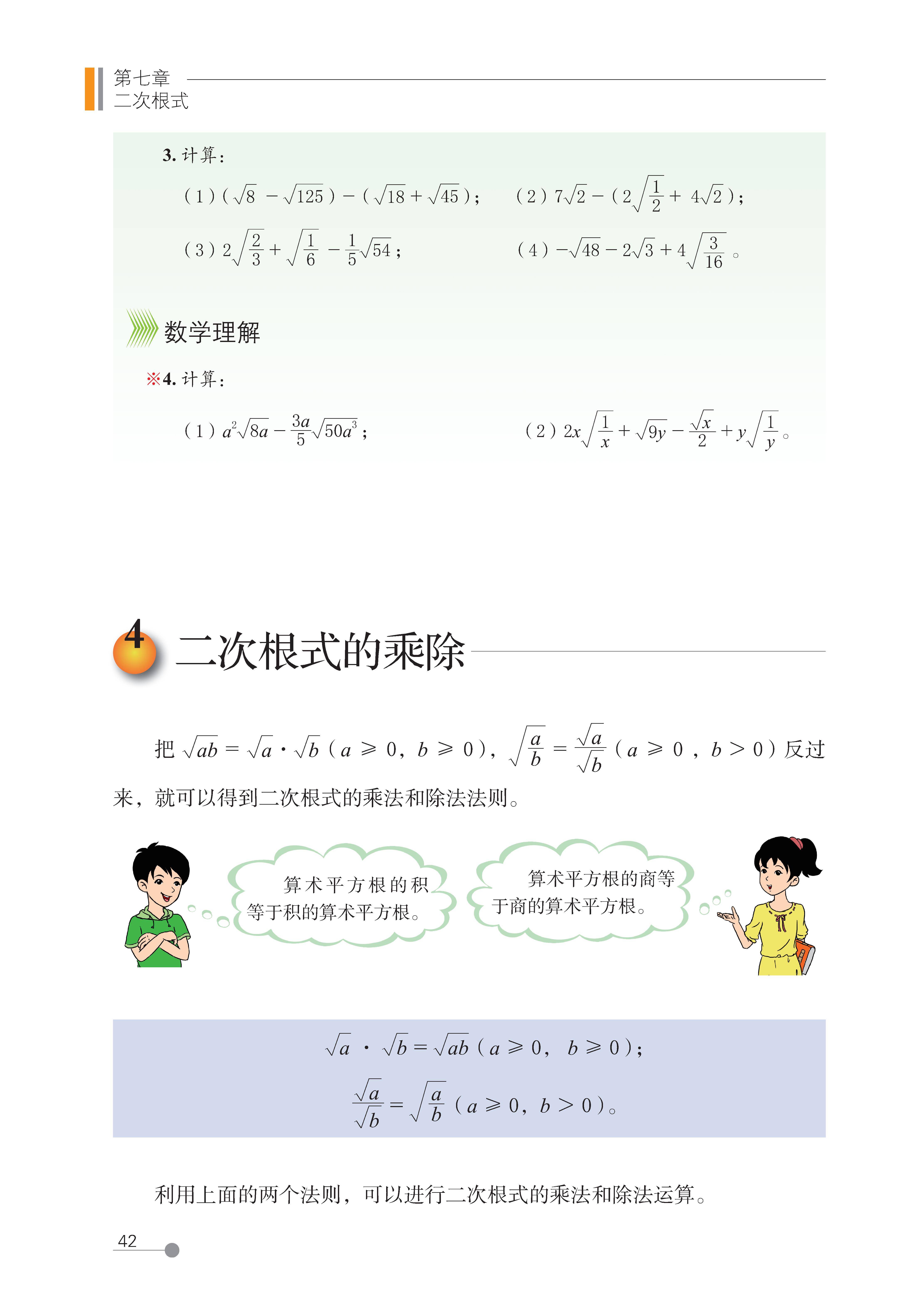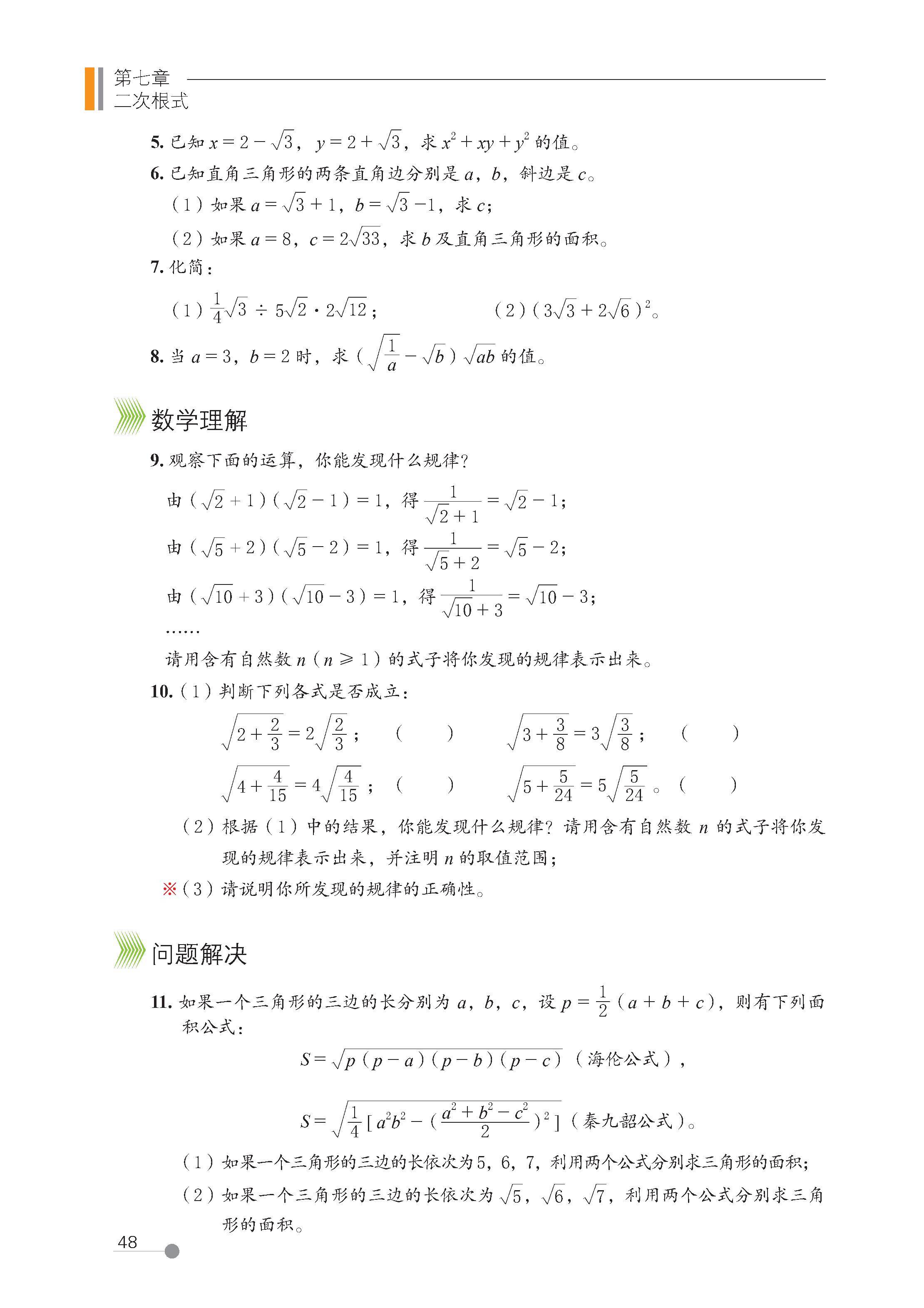 第七章 “二次根式”:核心是 “运算规则”,如√a・√b=√(ab)(a≥0,b≥0)、√a/√b=√(a/b)(a≥0,b>0),虽有 “分母有理化” 等细节,但只要掌握步骤,无需复杂的图形分析或逻辑推理;