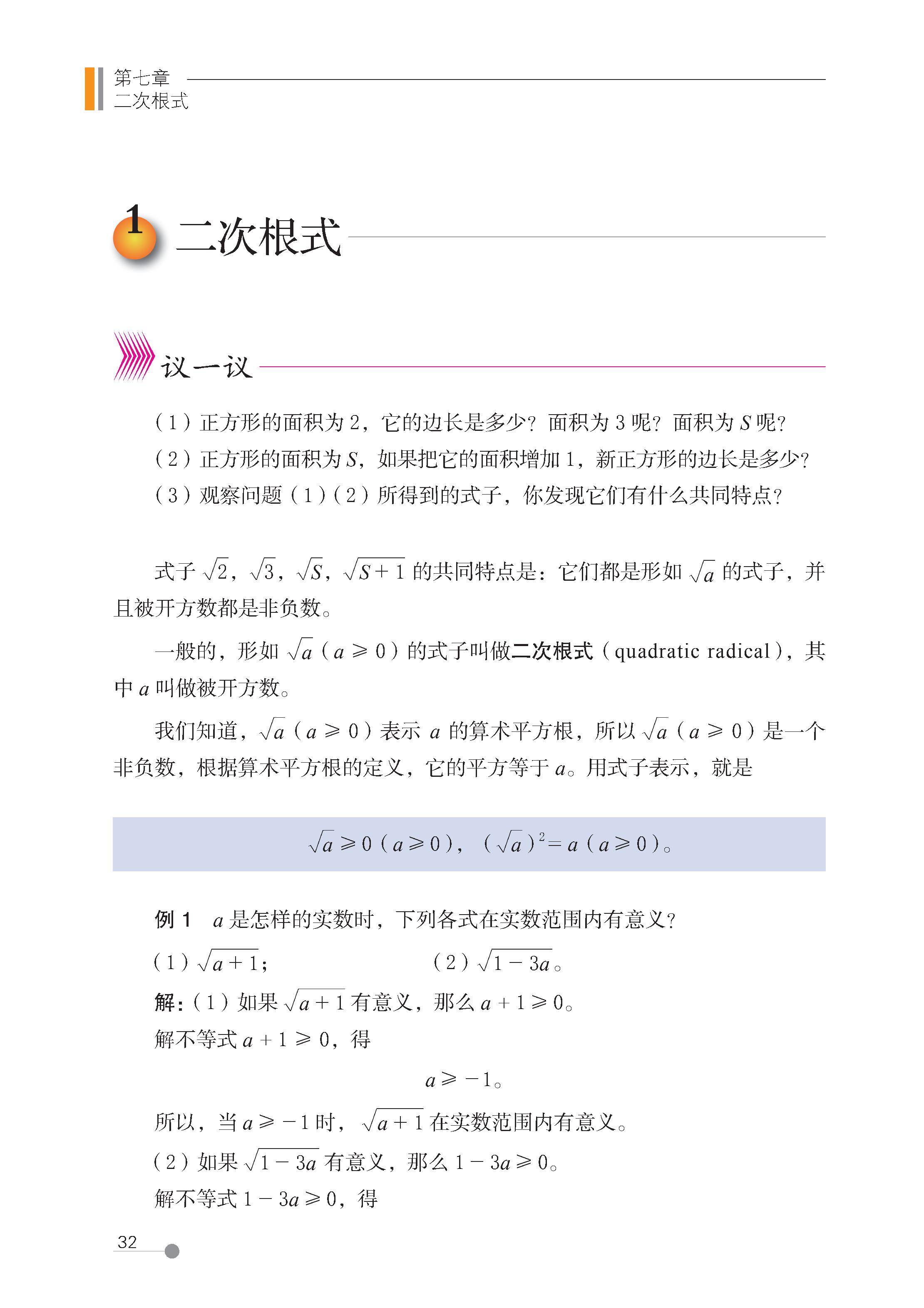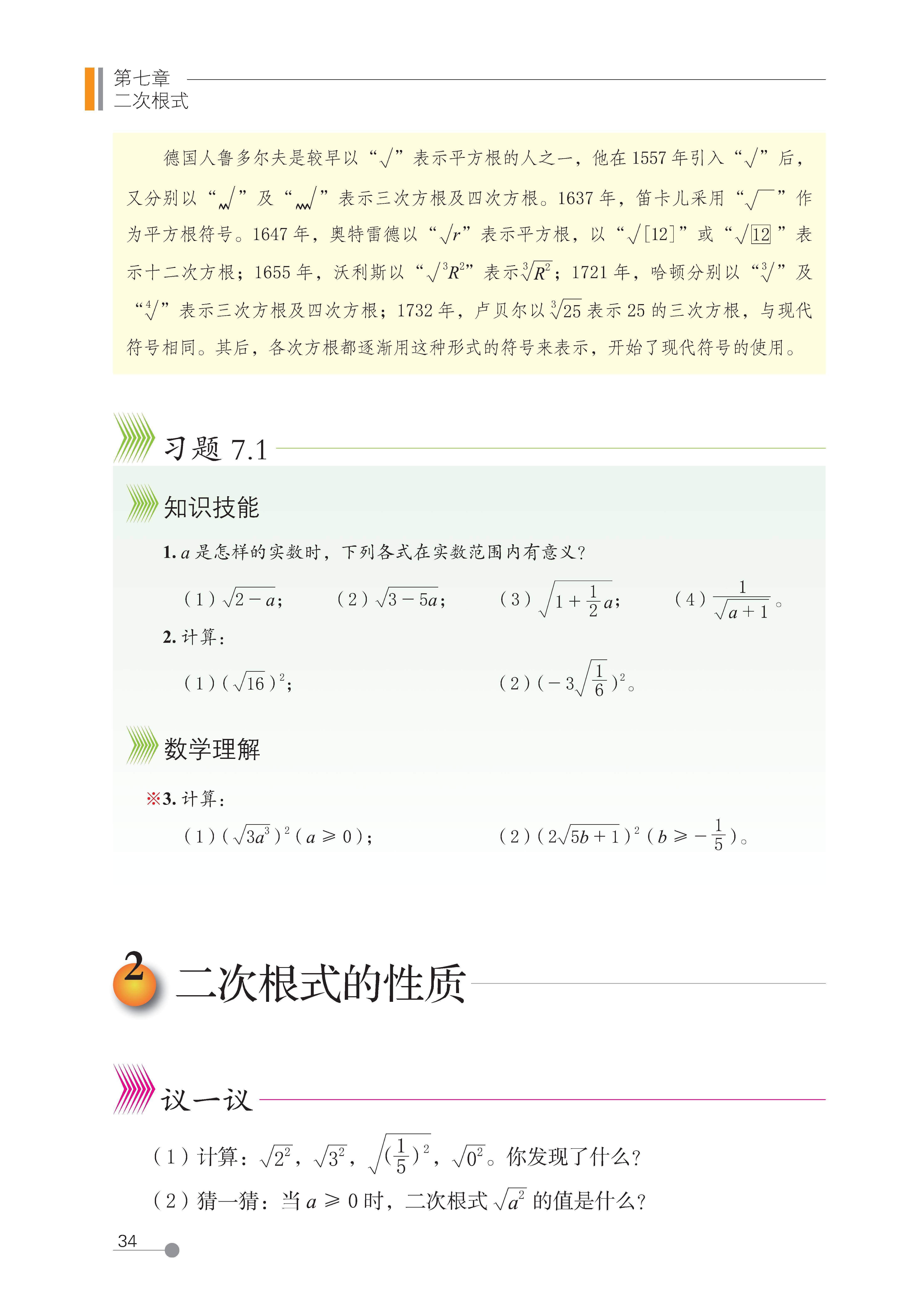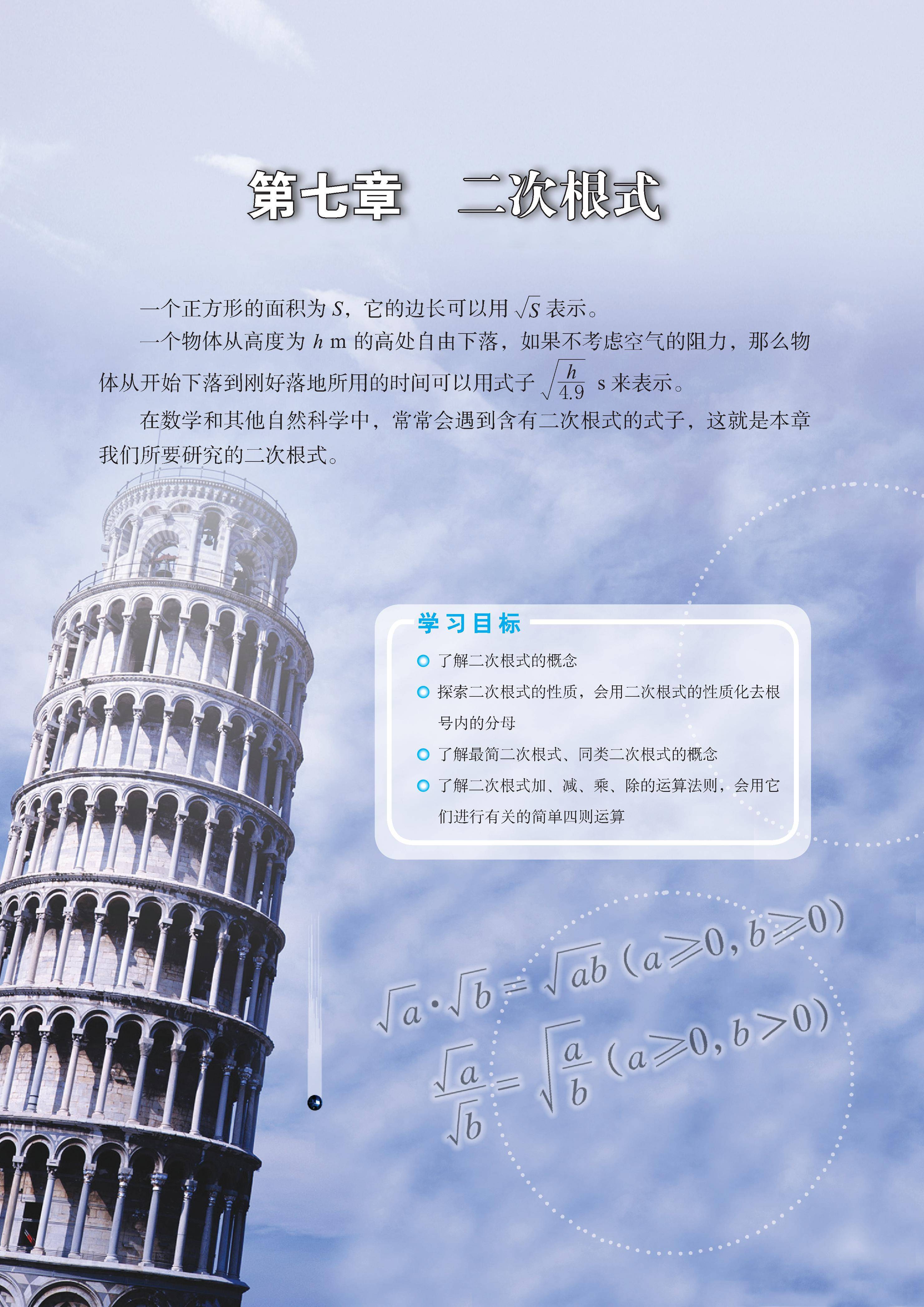 第七章 二次根式 概念、性质、运算(加减乘除、分母有理化) 1. 二次根式的非负性(√a 中 a≥0,√a≥0)的灵活应用;