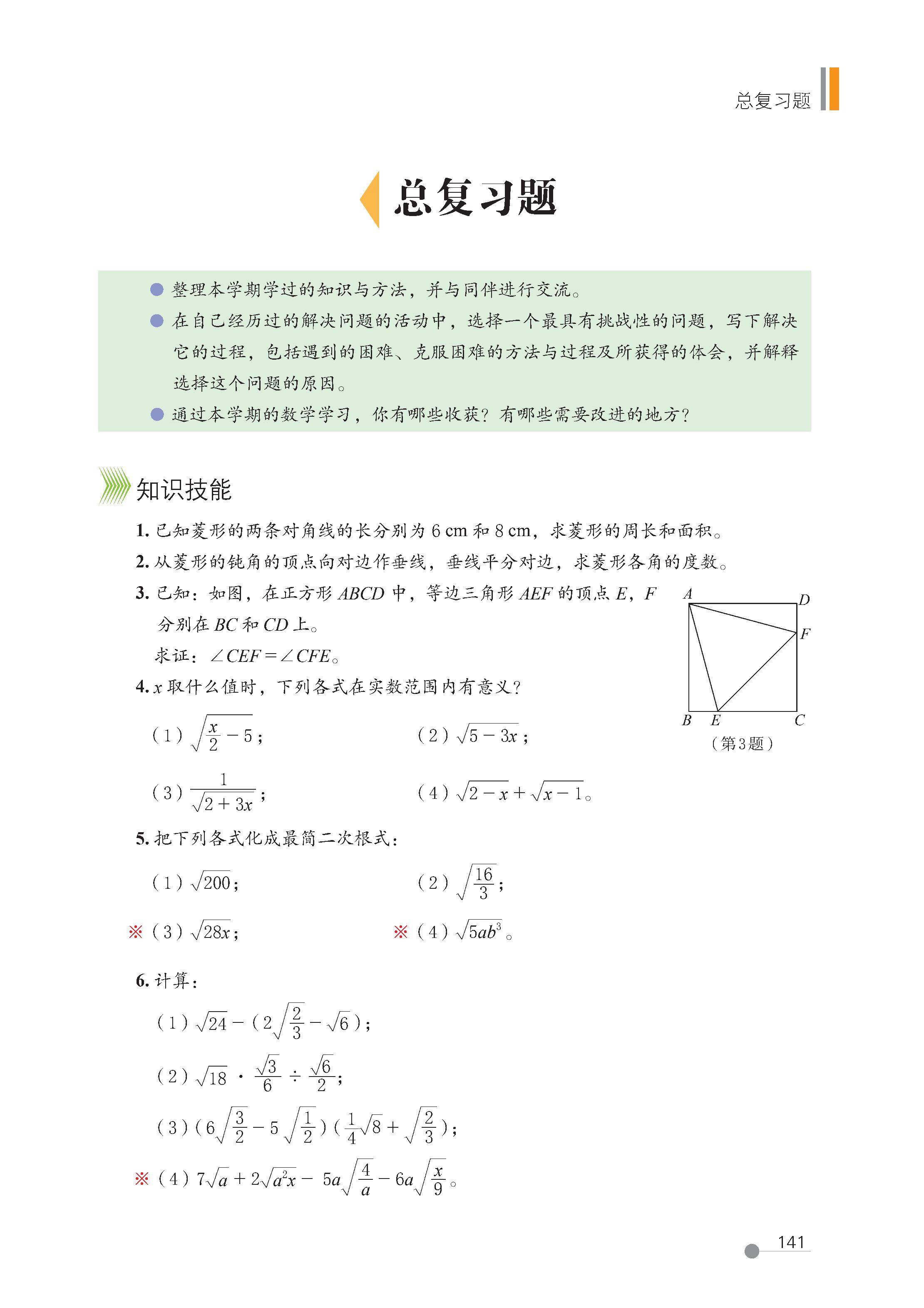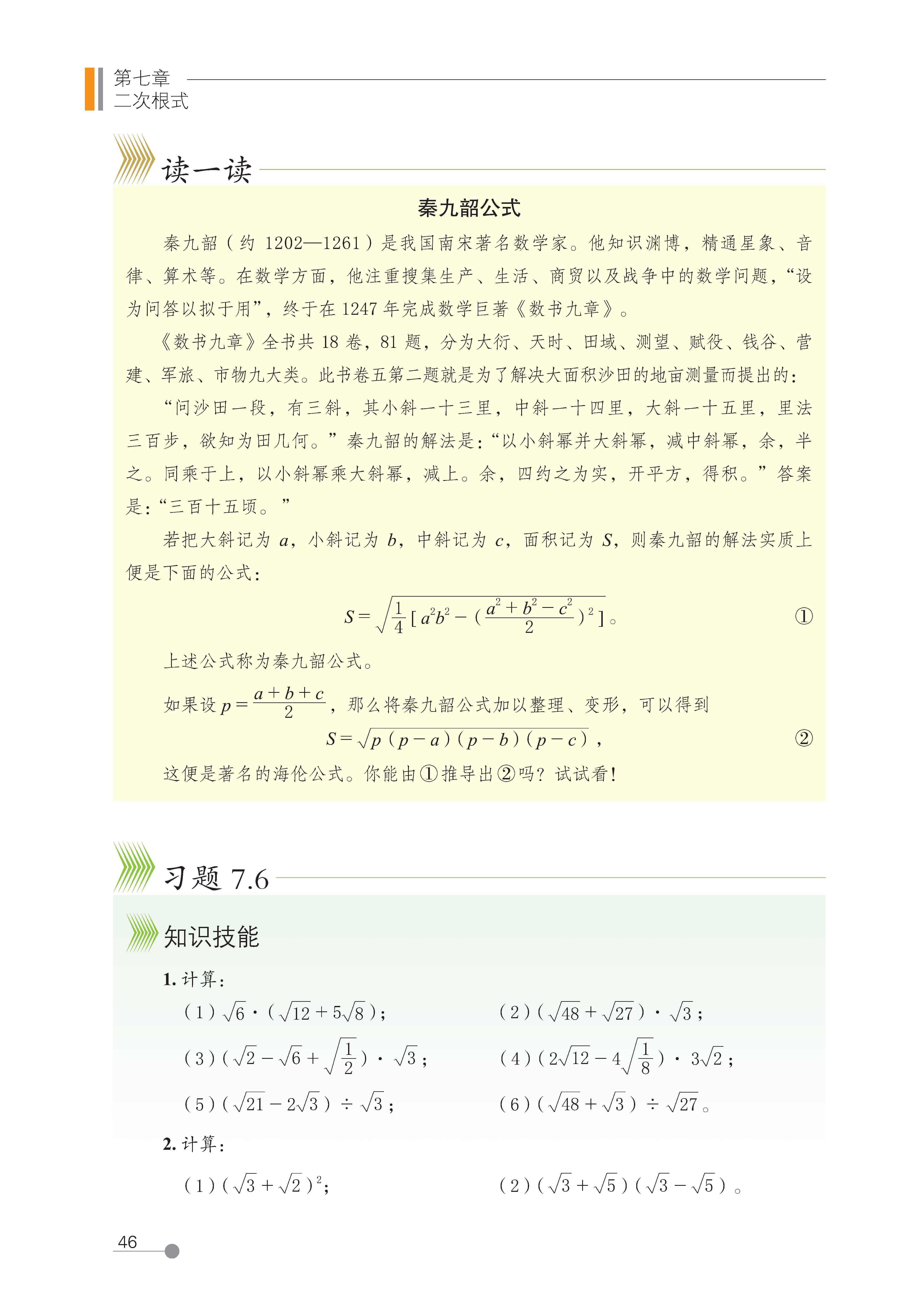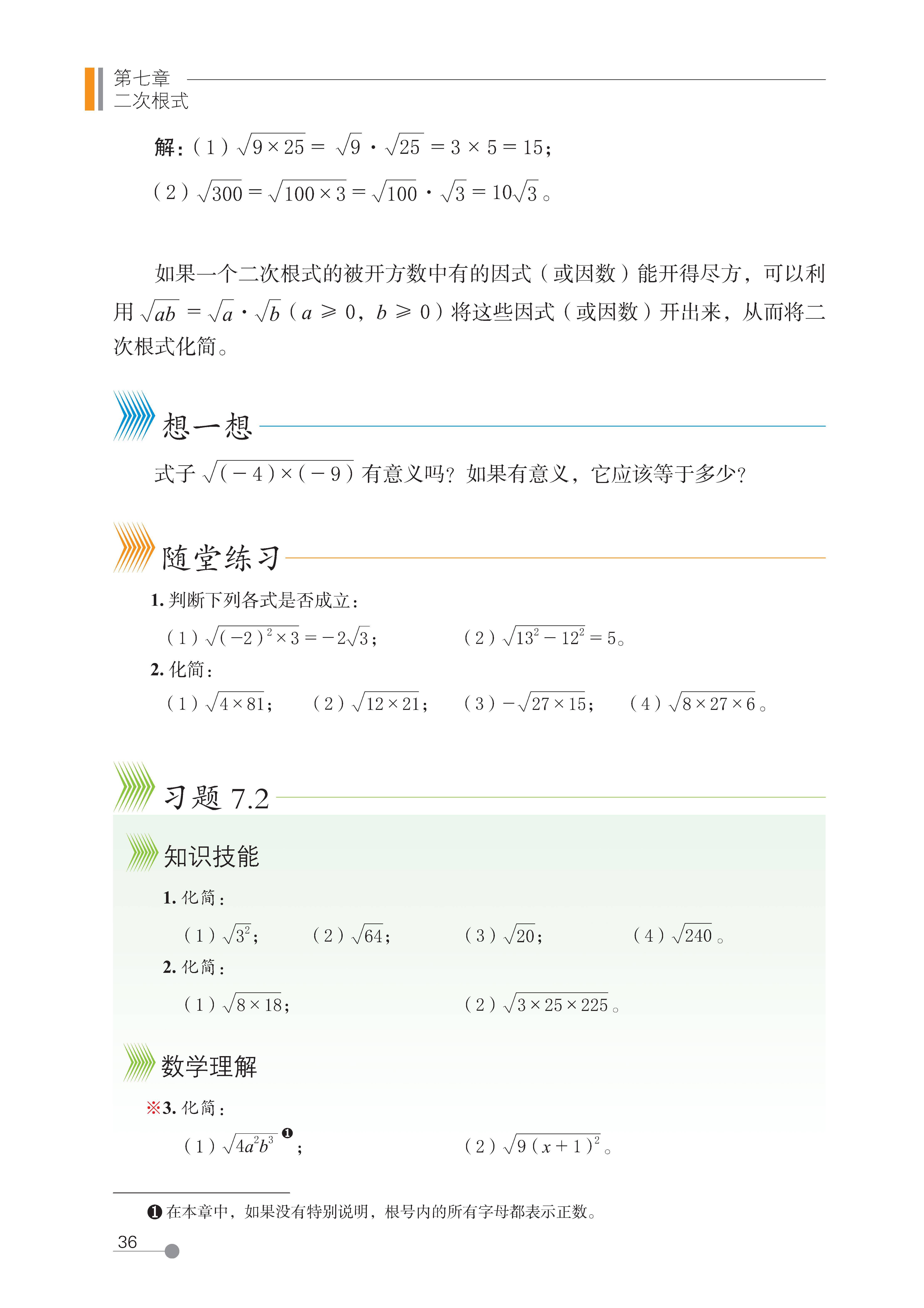 第七章 二次根式 概念、性质、运算(加减乘除、分母有理化) 1. 二次根式的非负性(√a 中 a≥0,√a≥0)的灵活应用;